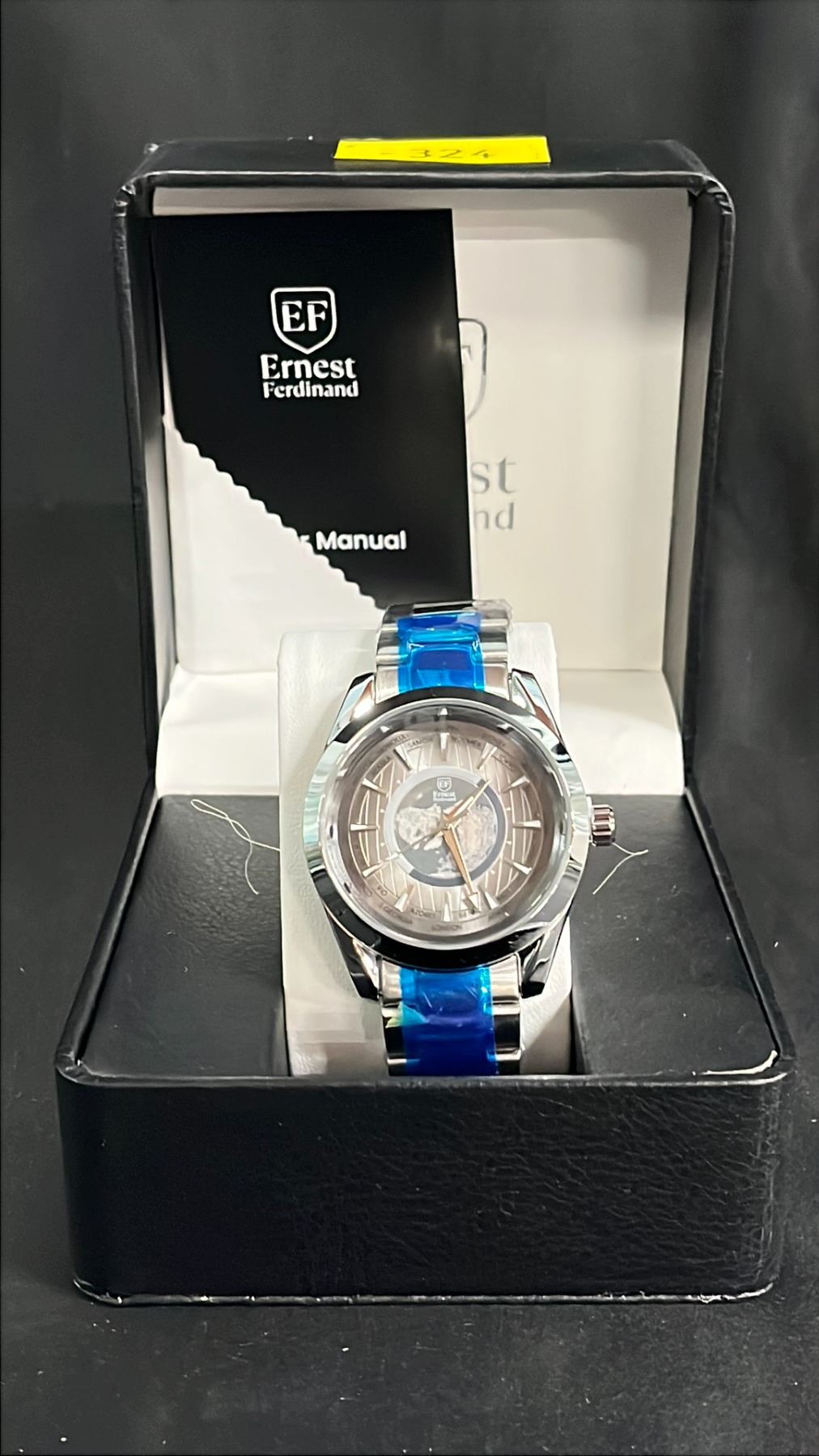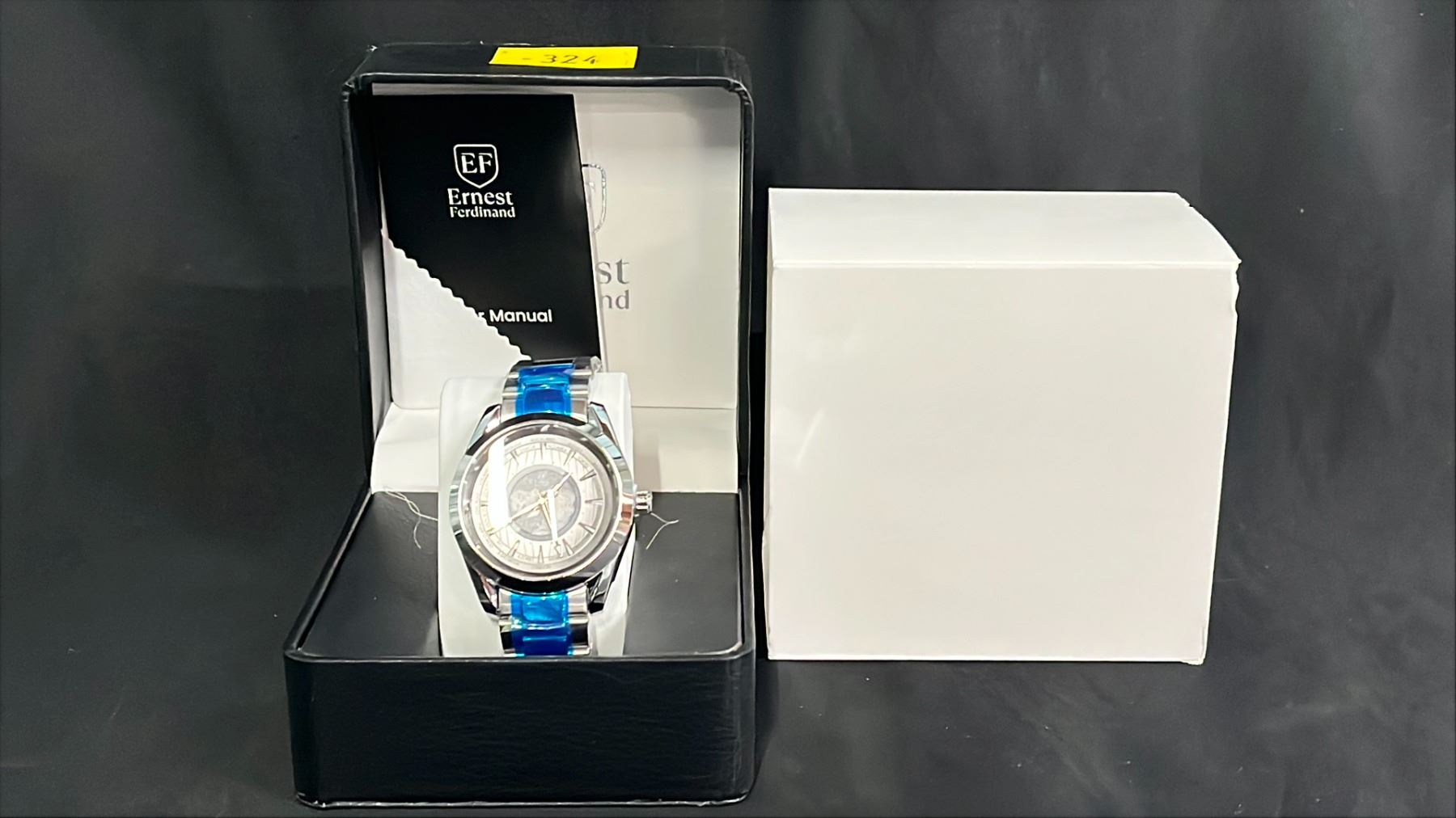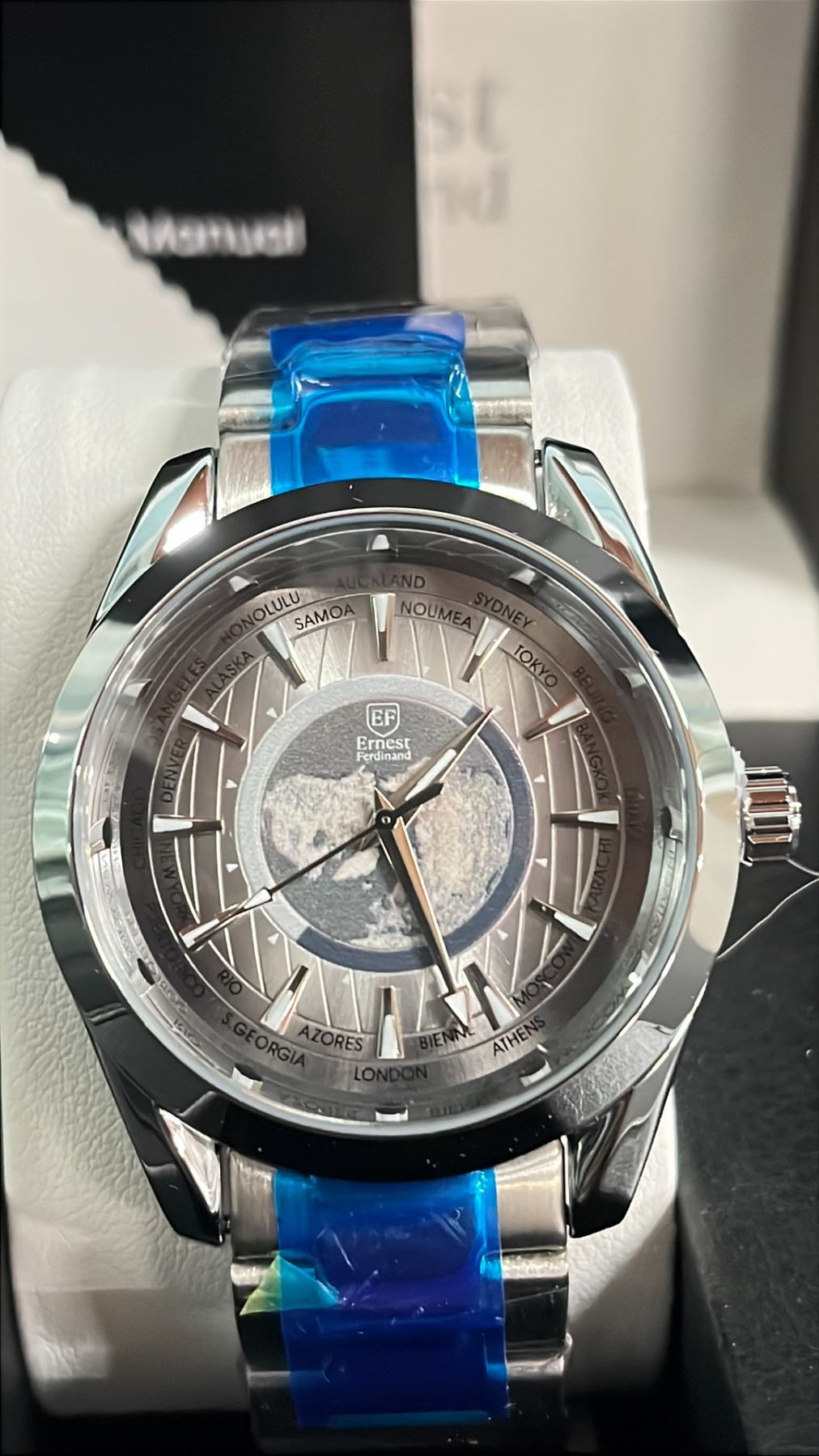 MEN-S ERNEST FERDINAND WATCH WITH GLOBAL DIAL & STAINLESS STEEL BAND IN BOX: 3ATM WATER RESISTANT