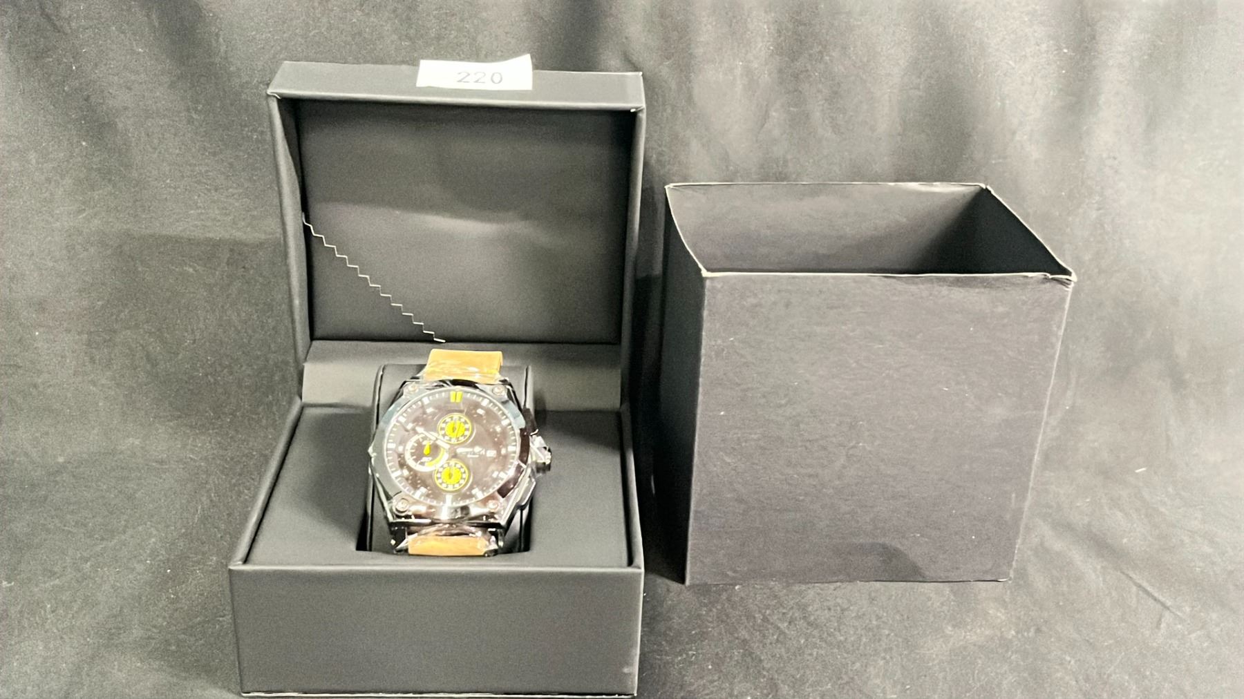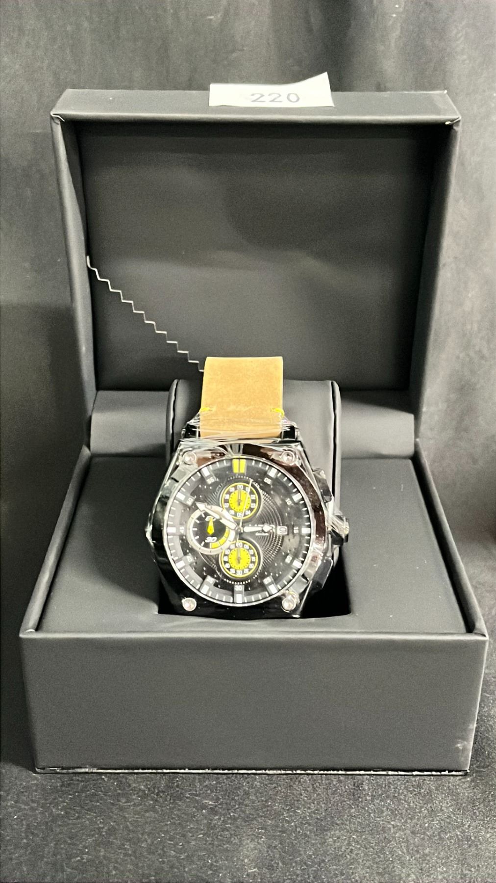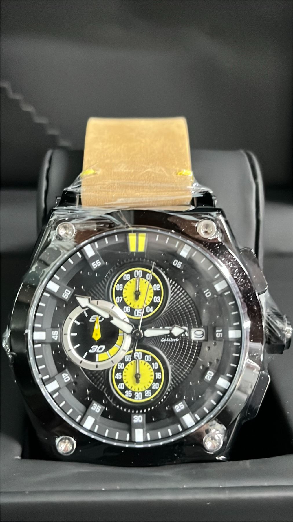 MEN'S LATOR CALIBRE 4787 CHRONOGRAPH WATCH WITH LEATHER STRAP: 42MM IP PLATED CASE BLACK DIAL WITH YELLOW DETAILING. CHRONOGRAPH MOVEMENT WITH DATE.