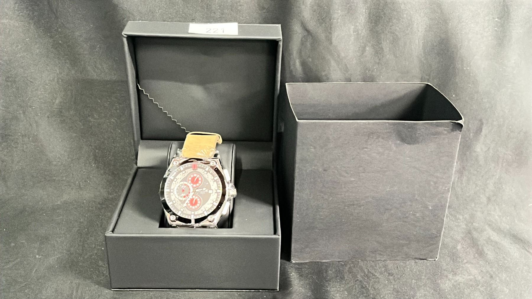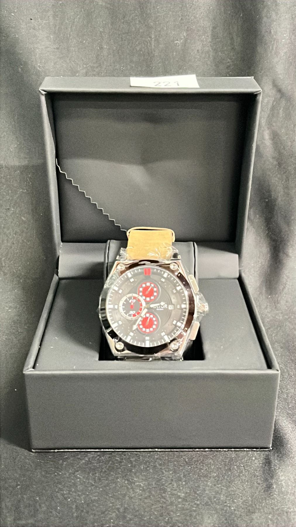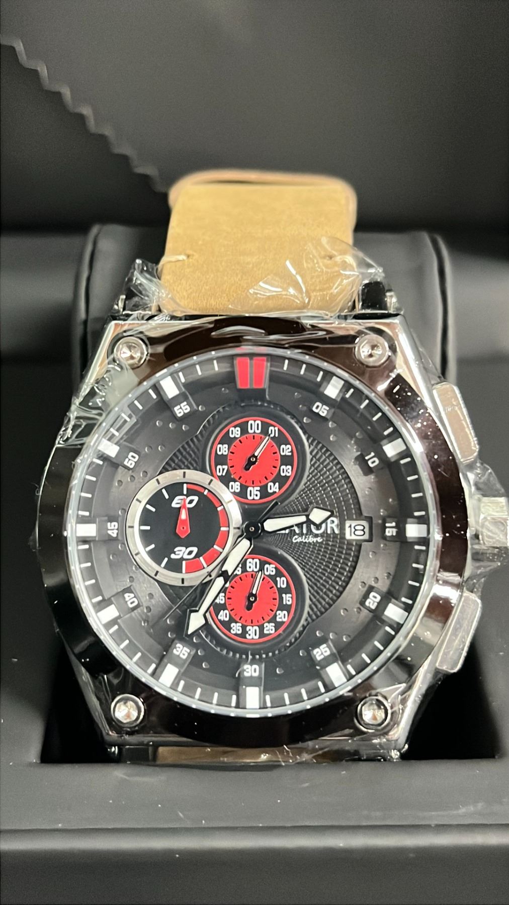 MEN'S LATOR CALIBRE 4787 CHRONOGRAPH WATCH WITH LEATHER STRAP: 42MM IP PLATED CASE BLACK DIAL WITH RED DETAILING. CHRONOGRAPH MOVEMENT WITH DATE.