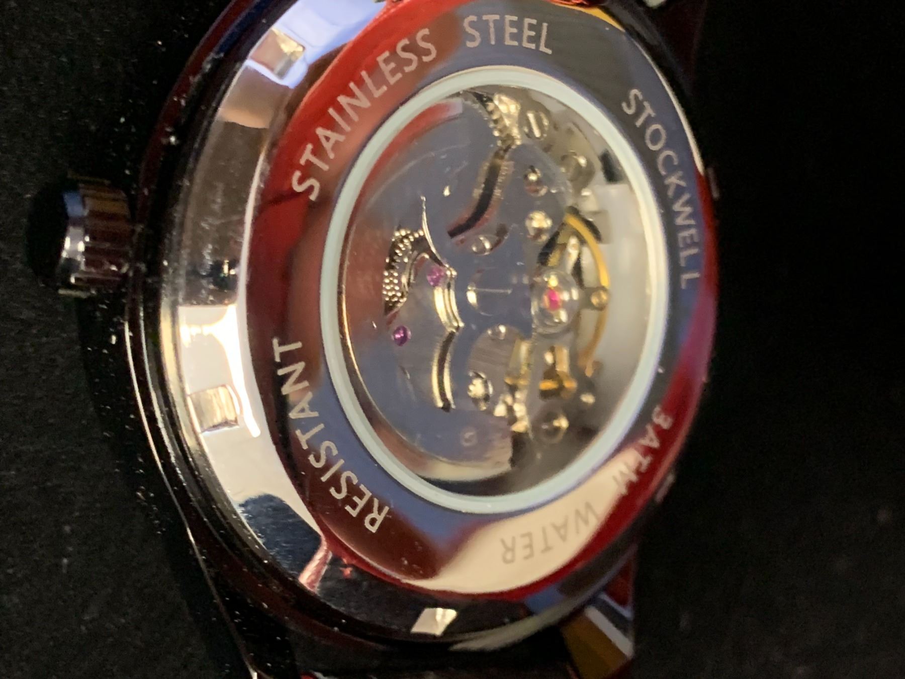 MEN'S STOCKWELL AUTOMATIC SPORTS WATCH, SKELETON DIAL, BLACK LEATHER STRAP WITH RED DETAILING
