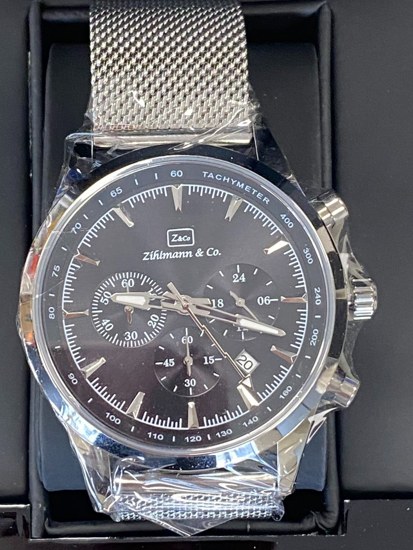MEN'S ZIHLMANN & CO CHRONOGRAPH WATCH, MODEL ZC70, SILVER COLOUR CASE, BLACK DIAL WITH SUB DIALS,