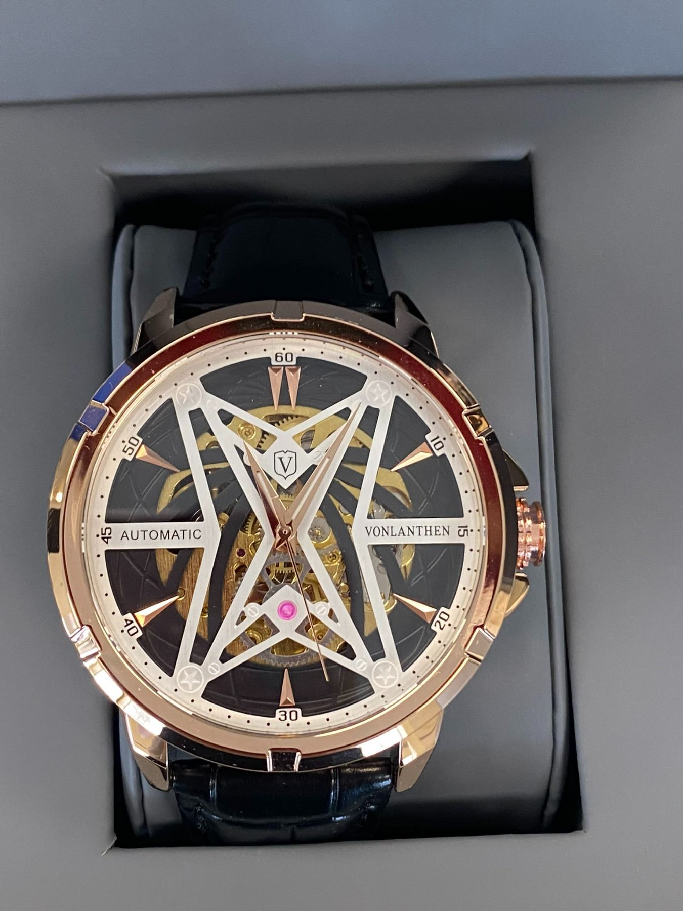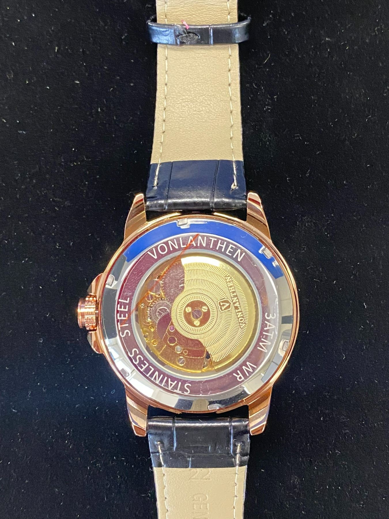 MENS VONLANTHEN AUTOMATIC SKELETON WATCH, V110 - GLASS EXHIBITION BACKCASE, BLACK LEATHER STRAP