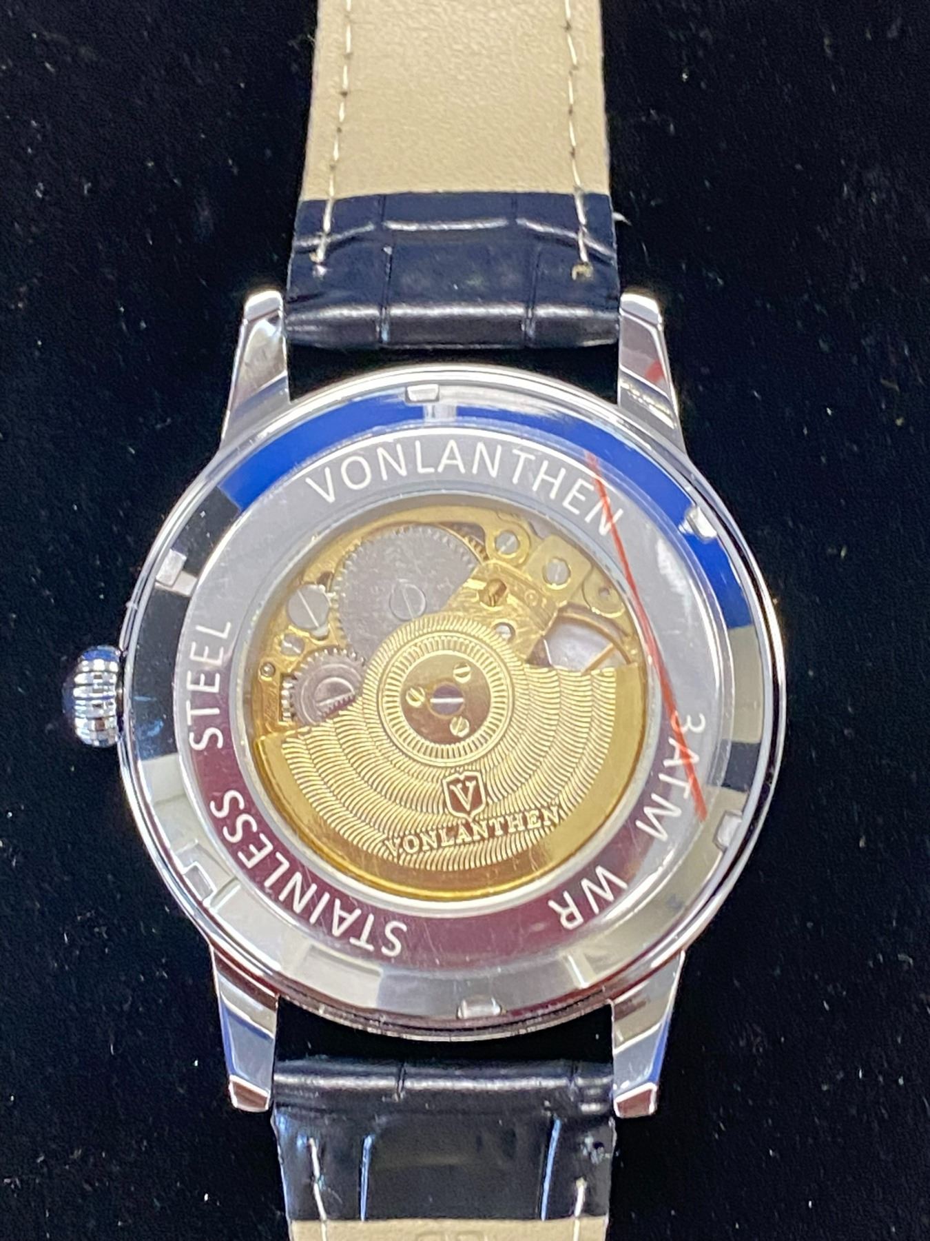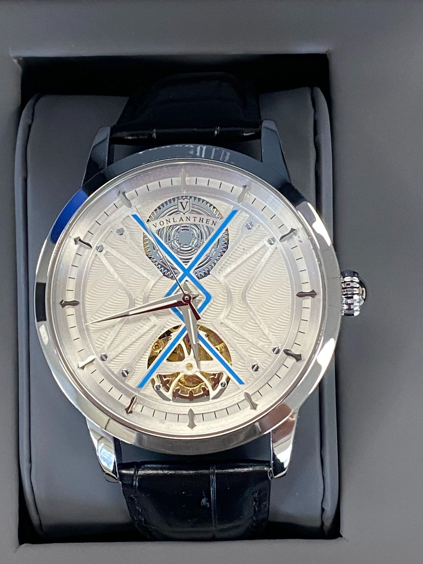 MENS VONLANTHEN AUTOMATIC WATCH, SILVER AND BLUE TEXTURED DIAL, GLASS EXHIBITION BACKCASE, BLACK