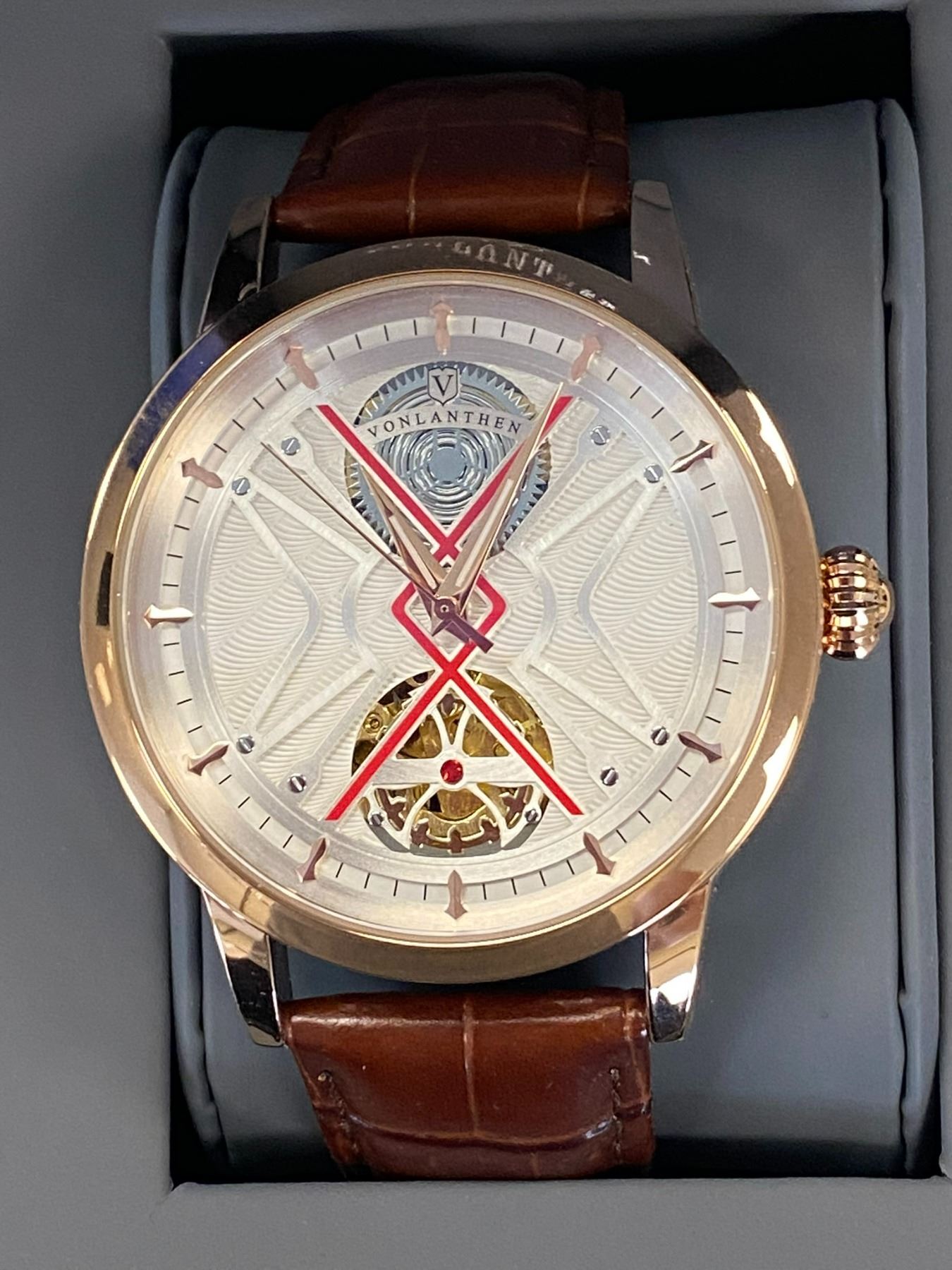MENS VONLANTHEN AUTOMATIC WATCH, SILVER AND RED TEXTURED DIAL, ROSE GOLD COLOURED CASE, GLASS