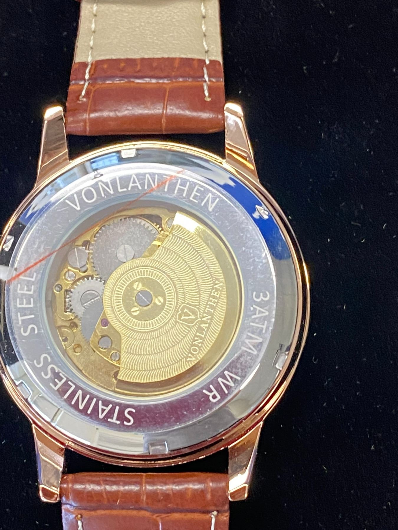 MENS VONLANTHEN AUTOMATIC WATCH, SILVER AND RED TEXTURED DIAL, ROSE GOLD COLOURED CASE, GLASS EXHIBITION BACKCASE, BROWN LEATHER STRAP