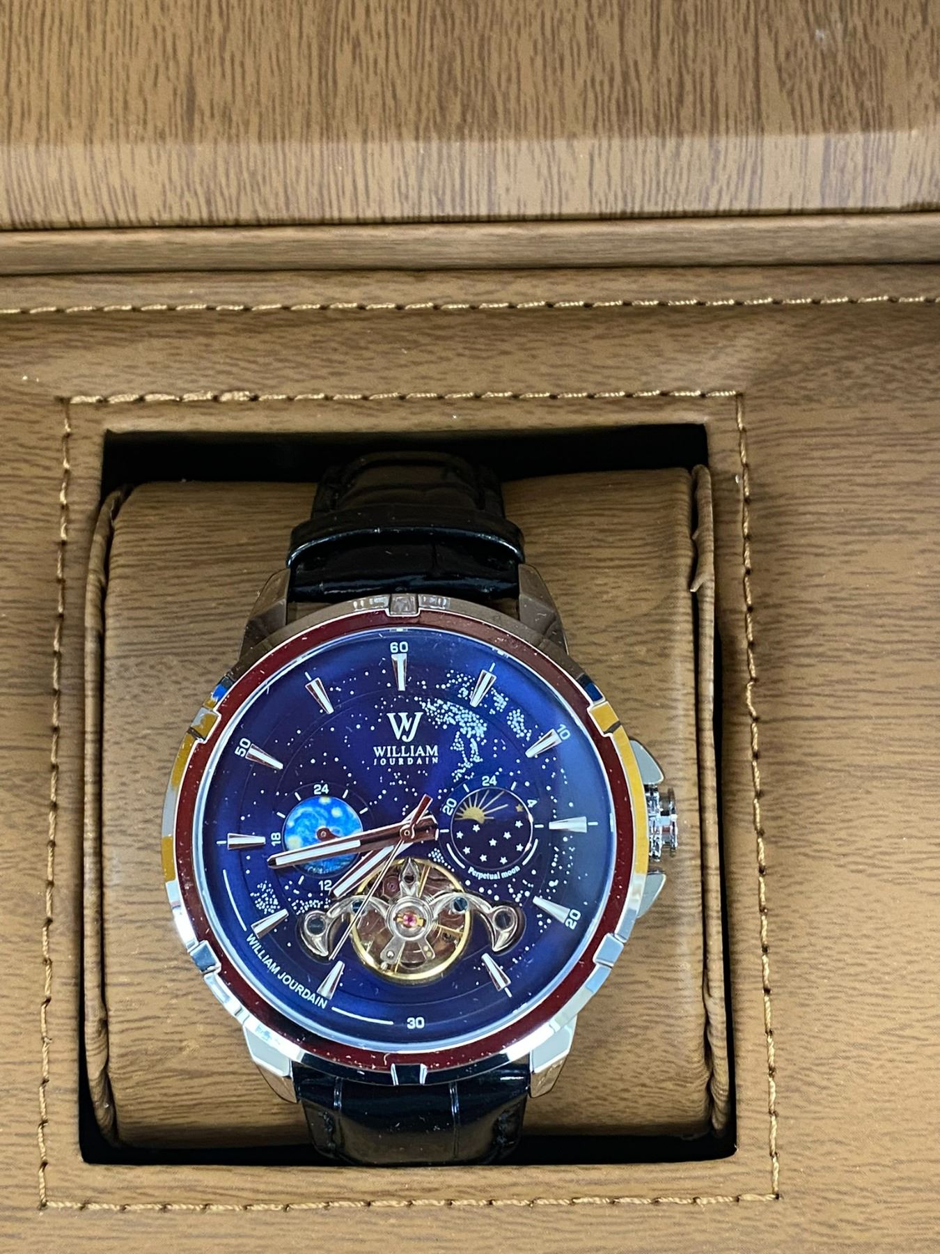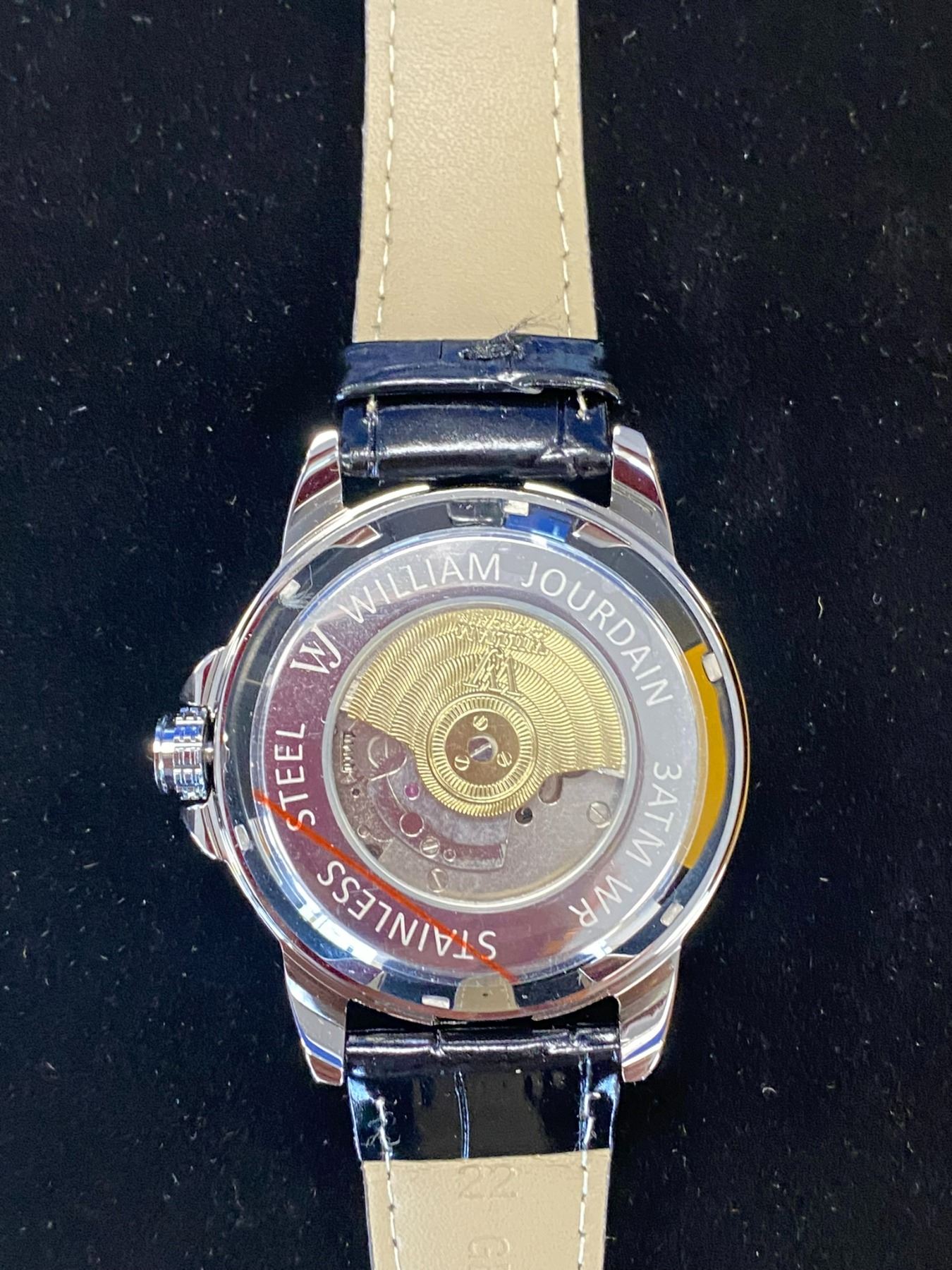 MENS WILLIAM JOURDAIN AUTOMATIC 2580 WATCH, OPEN HEART MOVEMENT WITH SUB DIALS, GLASS EXHIBITION BACK CASE, BLACK GENUINE LEATHER STRAP