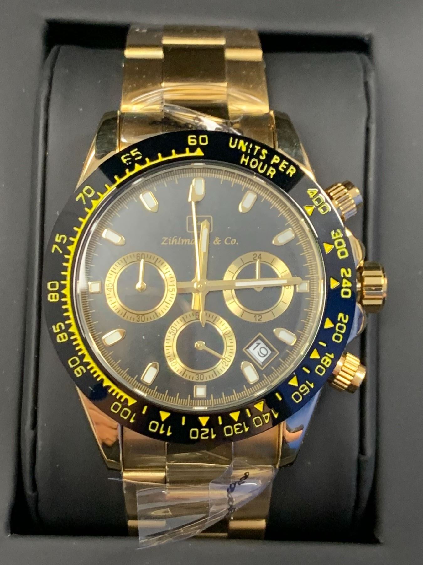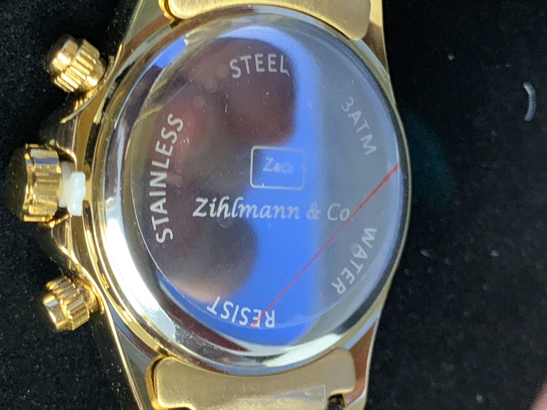 MENS ZIHLMANN & CO Z400 WATCH, CHRONOGRAPH MOVEMENT, GOLD COLOUR STAINLESS STEEL STRAP, BLACK DIAL, 3ATM WATER RESISTANT
