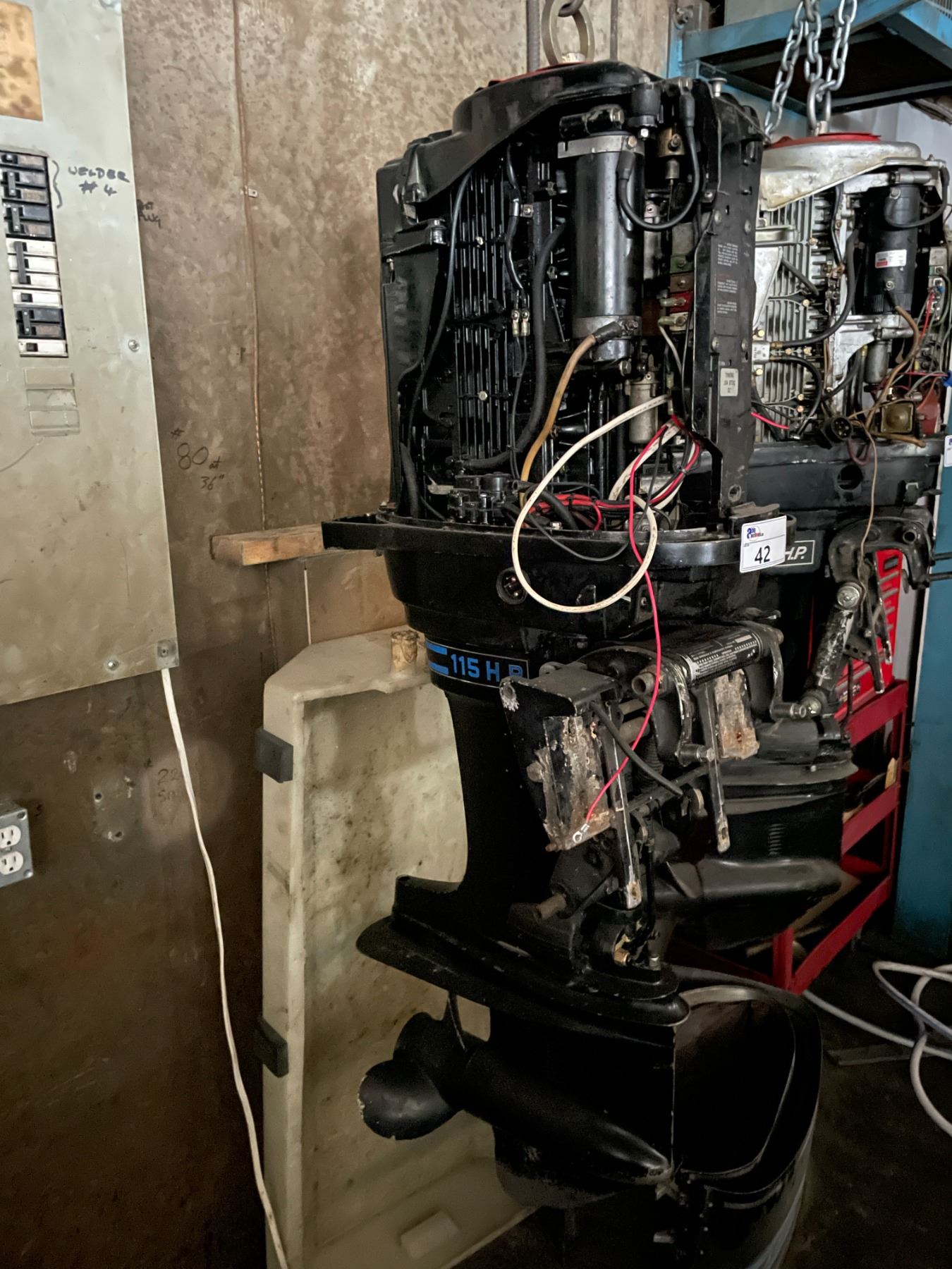 MERCURY 115HP OUTBOARD BOAT MOTOR HANGING ON CHAIN, MUST HAVE PROPER PEOPLE / EQUIPMENT TO REMOVE *IN REPAIR RUNNING CONDITION UNKNOWN*