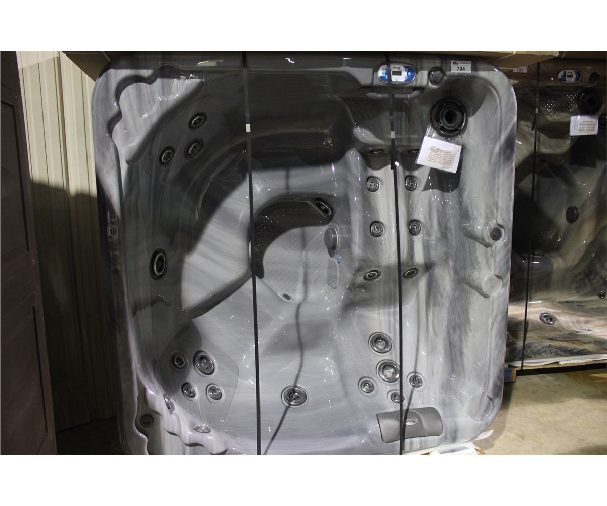 MERMAID SPAS 6 PERSON HOT TUB, STORM CLOUDS INTERIOR, GREY CABINET, OZONE, 1 PUMP - 3HP, 2SP (8.8 AMP), HEADREST, LOUNGER, 25 STAINLESS/GRAPHITE JETS, 76" X 76"X33"