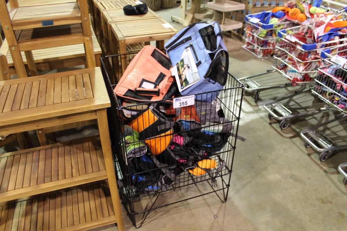 MESH BASKET OF ASSORTED DOG COATS, BACKPACKS & CARRIERS (BASKET NOT INCLUDED)