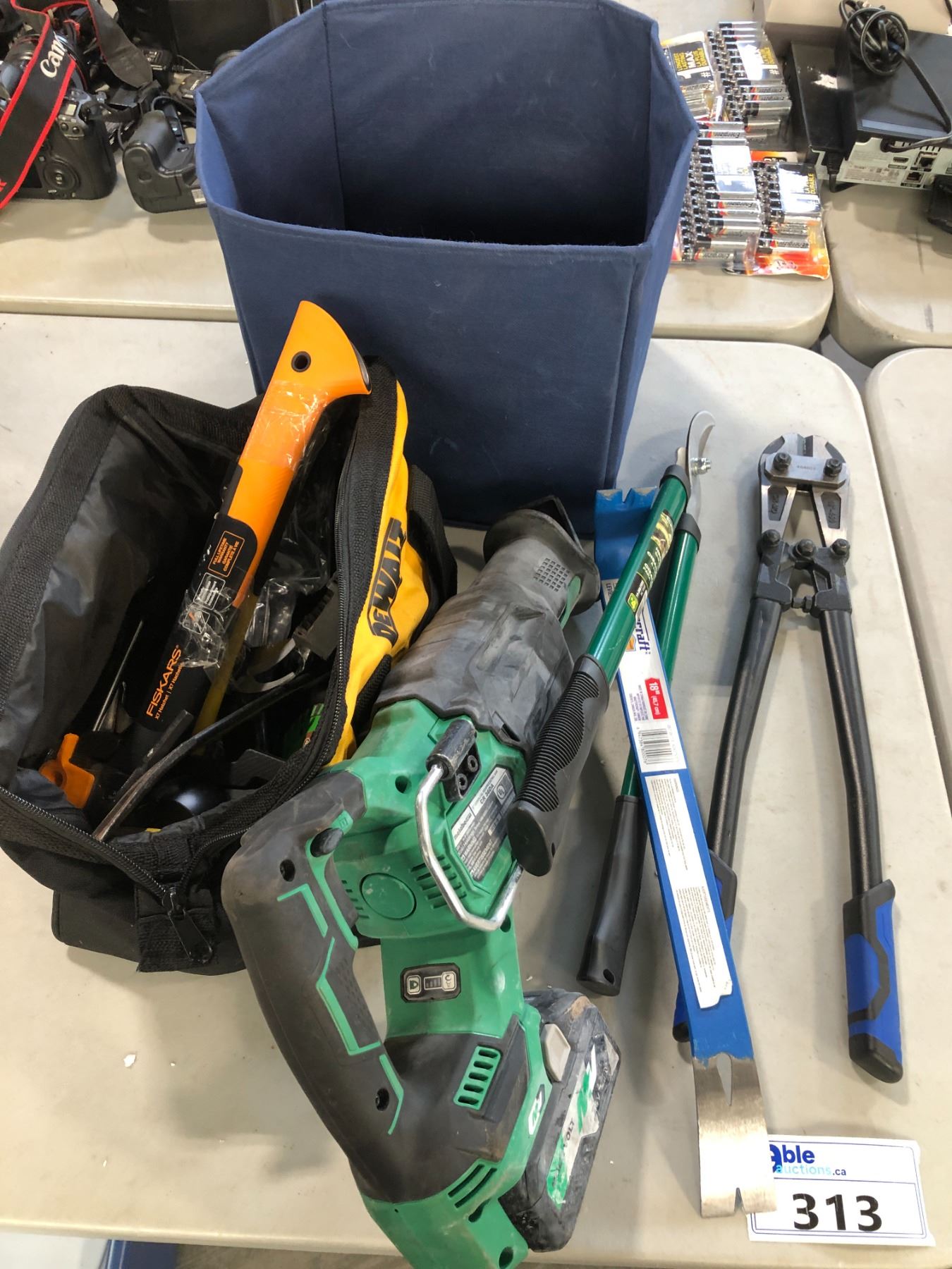 METABO CR36DA CORDLESS RECIPROCATING SAW NO CHARGER INCLUDING DEWALT BAG WITH HAND TOOLS, BOLT CUTTER, GARDEN TOOL AND MORE