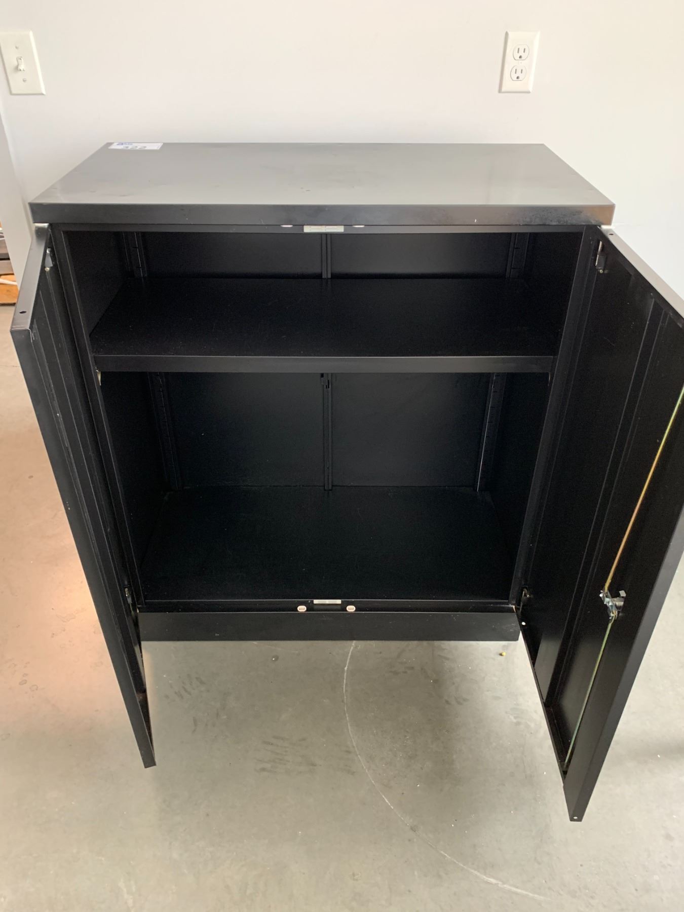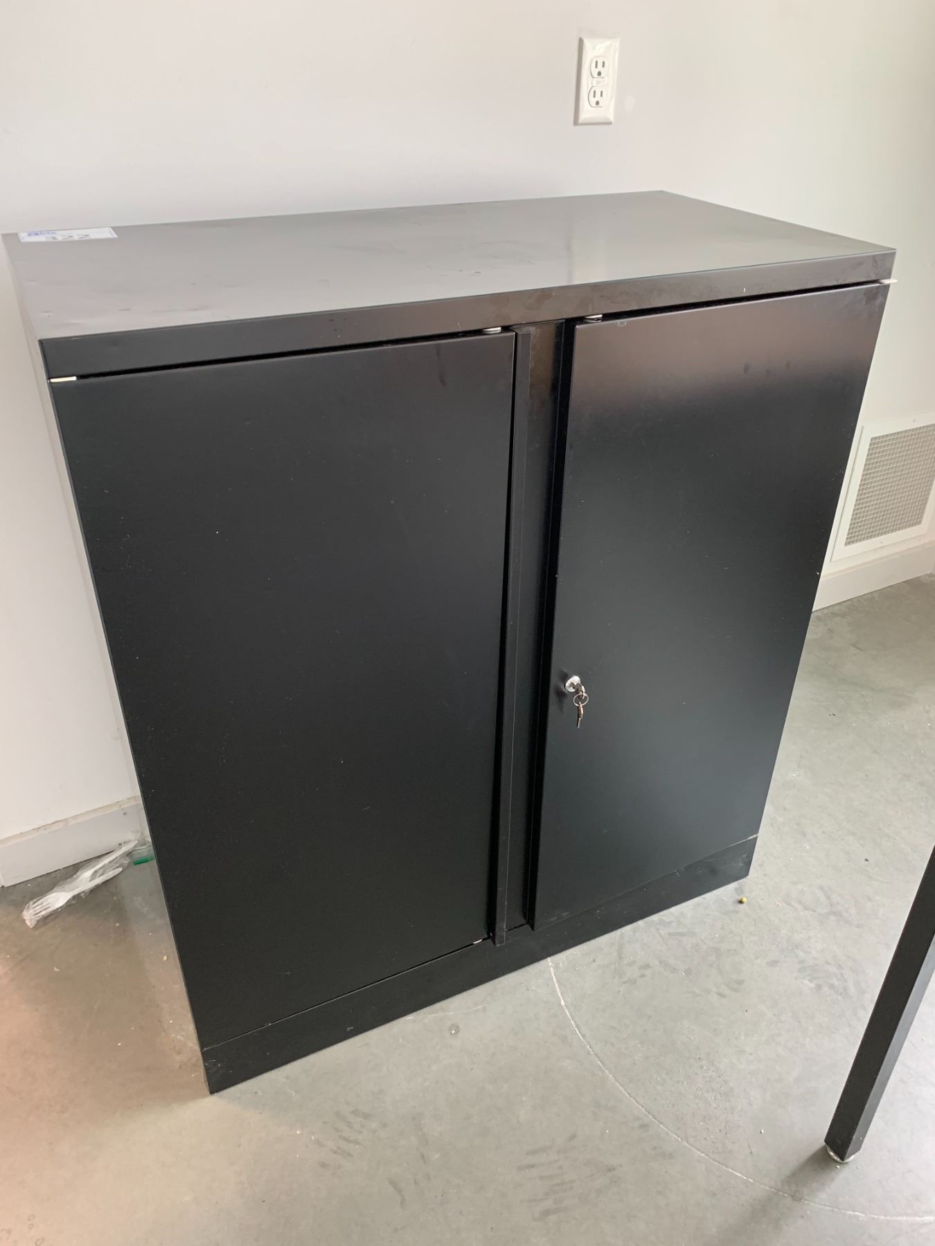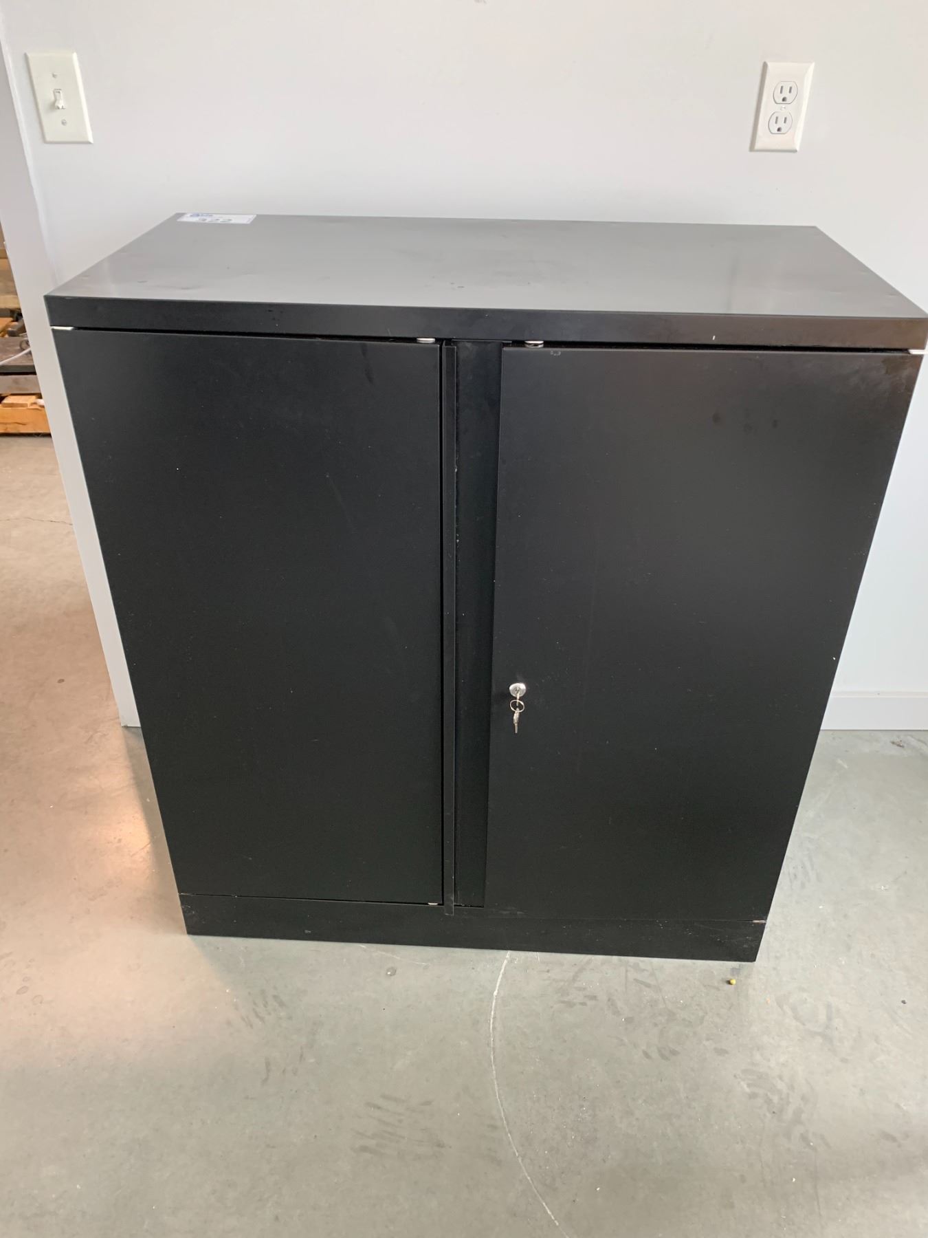 METAL 2 DOOR STORAGE CABINET W/ KEY APPROX 3FT ACROSS X 1 1/2FT WIDE X 2 3/4FT HIGH