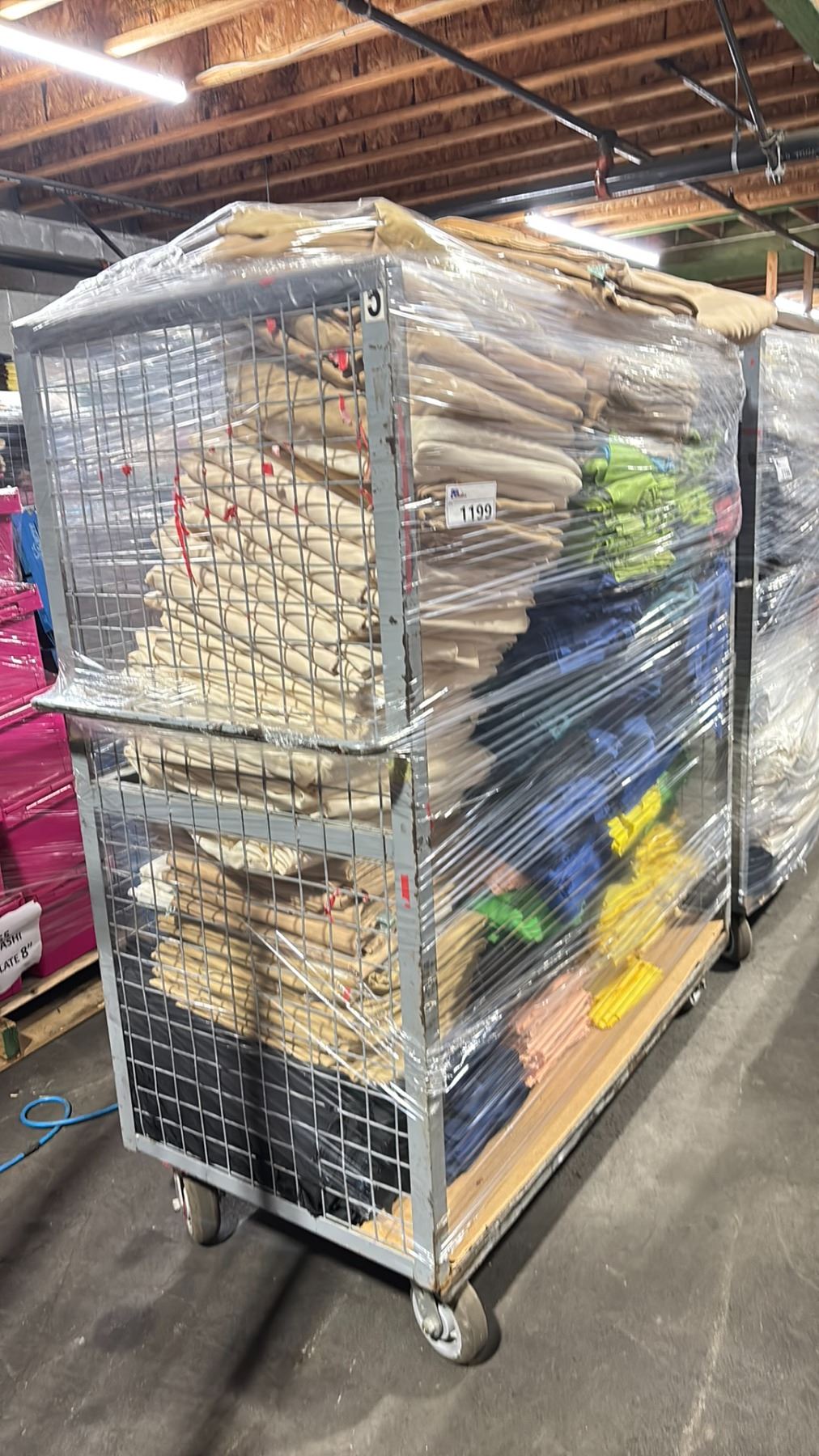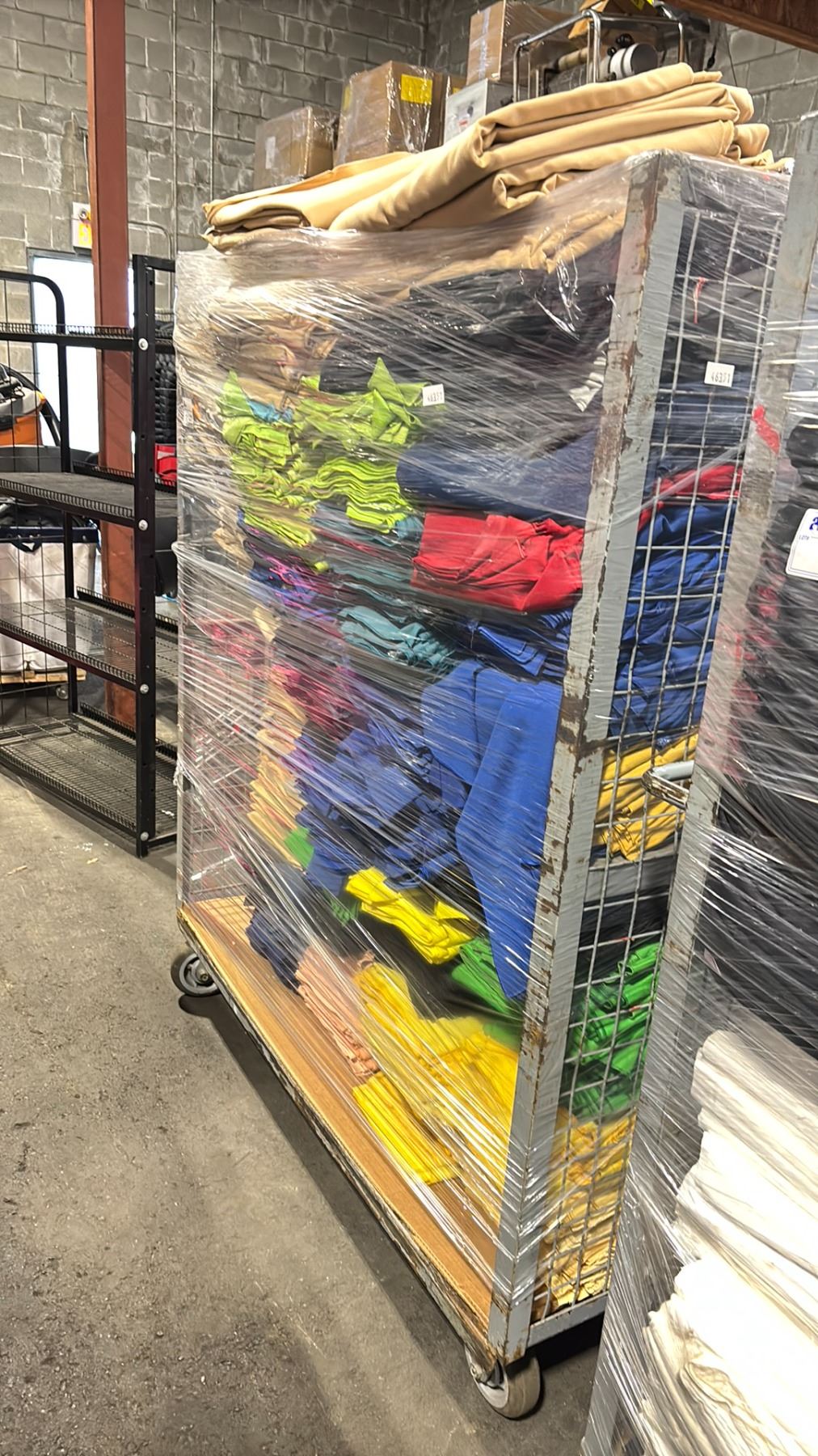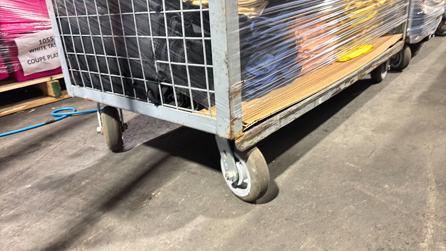 METAL 2 TIER COMMERCIAL MOBILE STORAGE RACK WITH ASSORTED COLOR PROFESSIONAL EVENT / BANQUET TABLE LINENS - RACK SIZE 53"W X 27"D X 62"H *RACK INCLUDED*