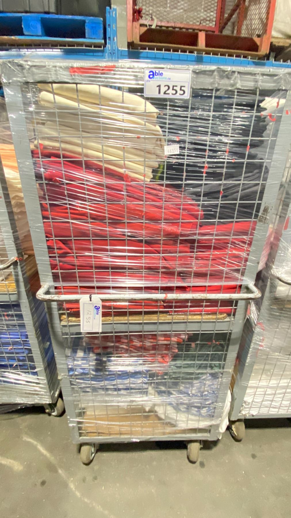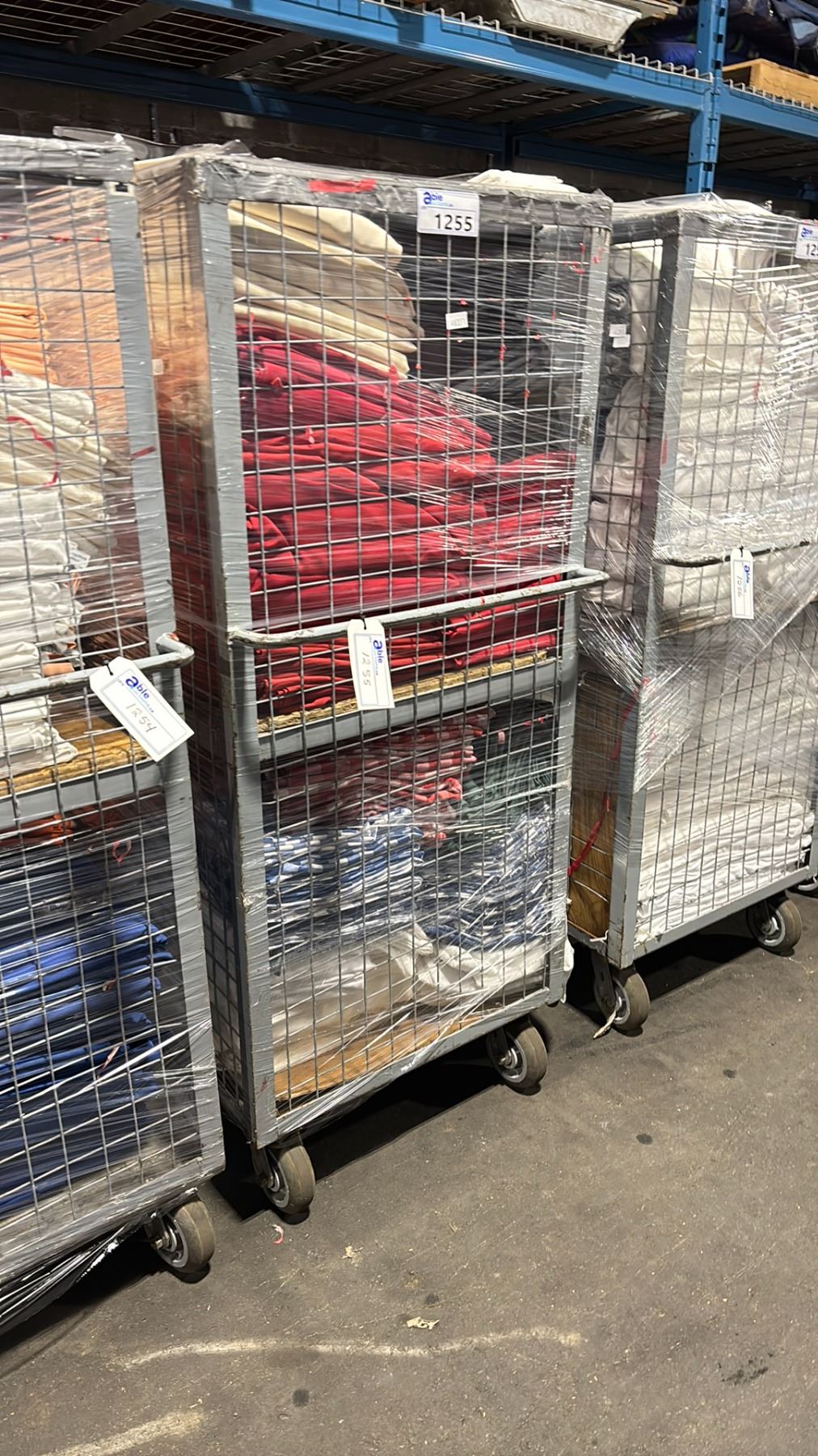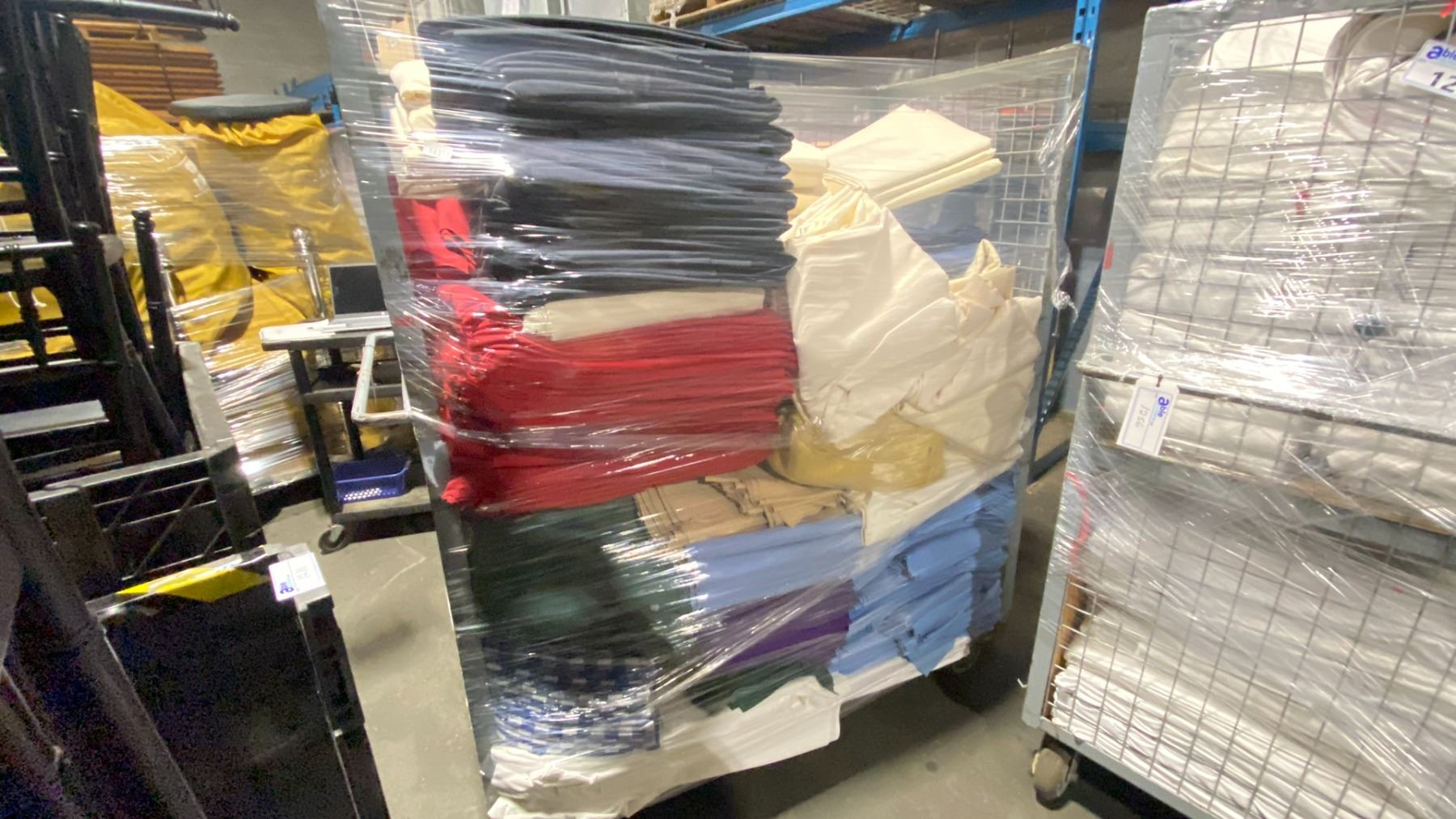 METAL 2 TIER COMMERCIAL MOBILE STORAGE RACK WITH ASSORTED COLOR PROFESSIONAL EVENT / BANQUET TABLE LINENS - RACK SIZE 53"W X 27"D X 62"H *RACK INCLUDED*