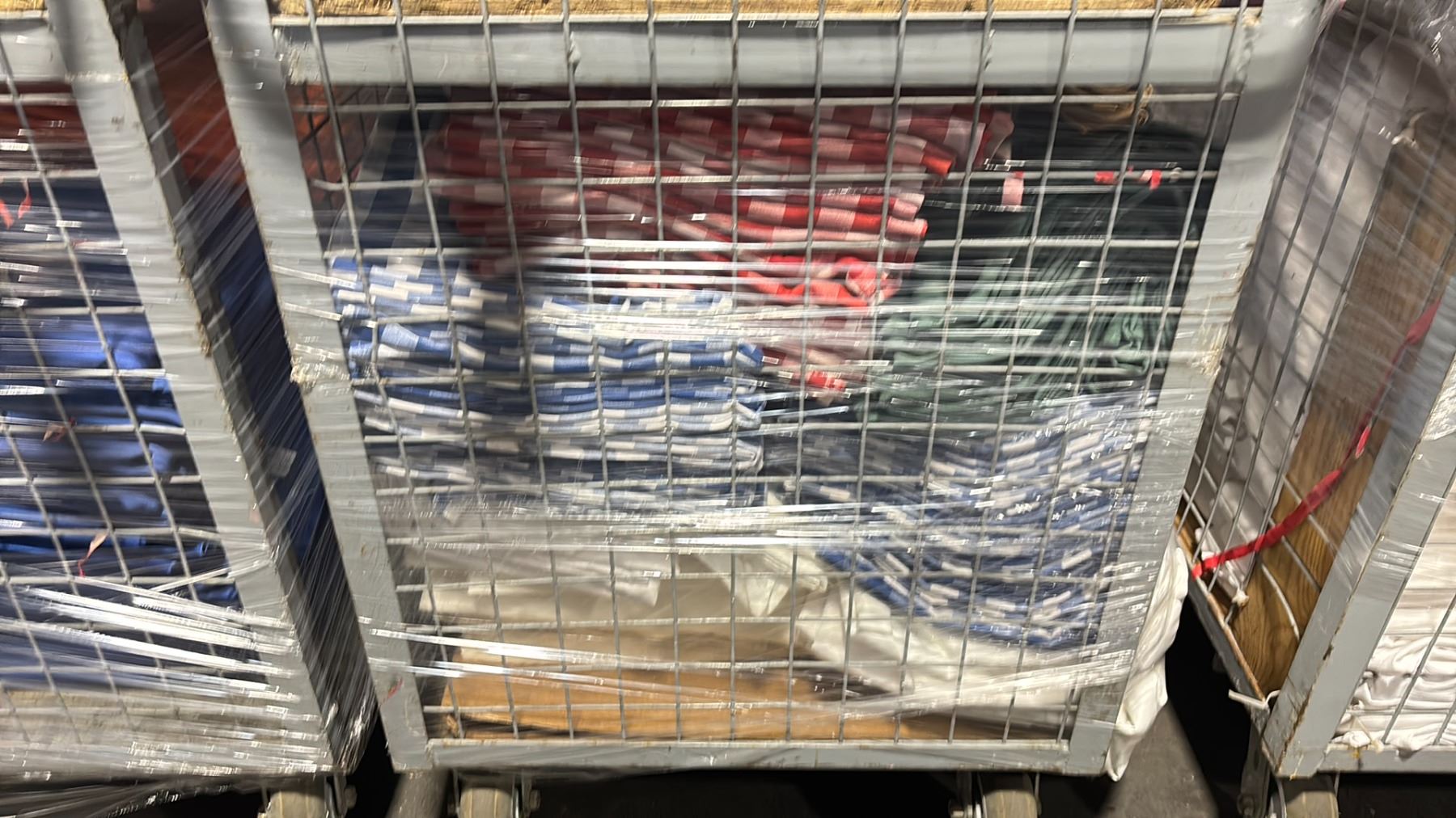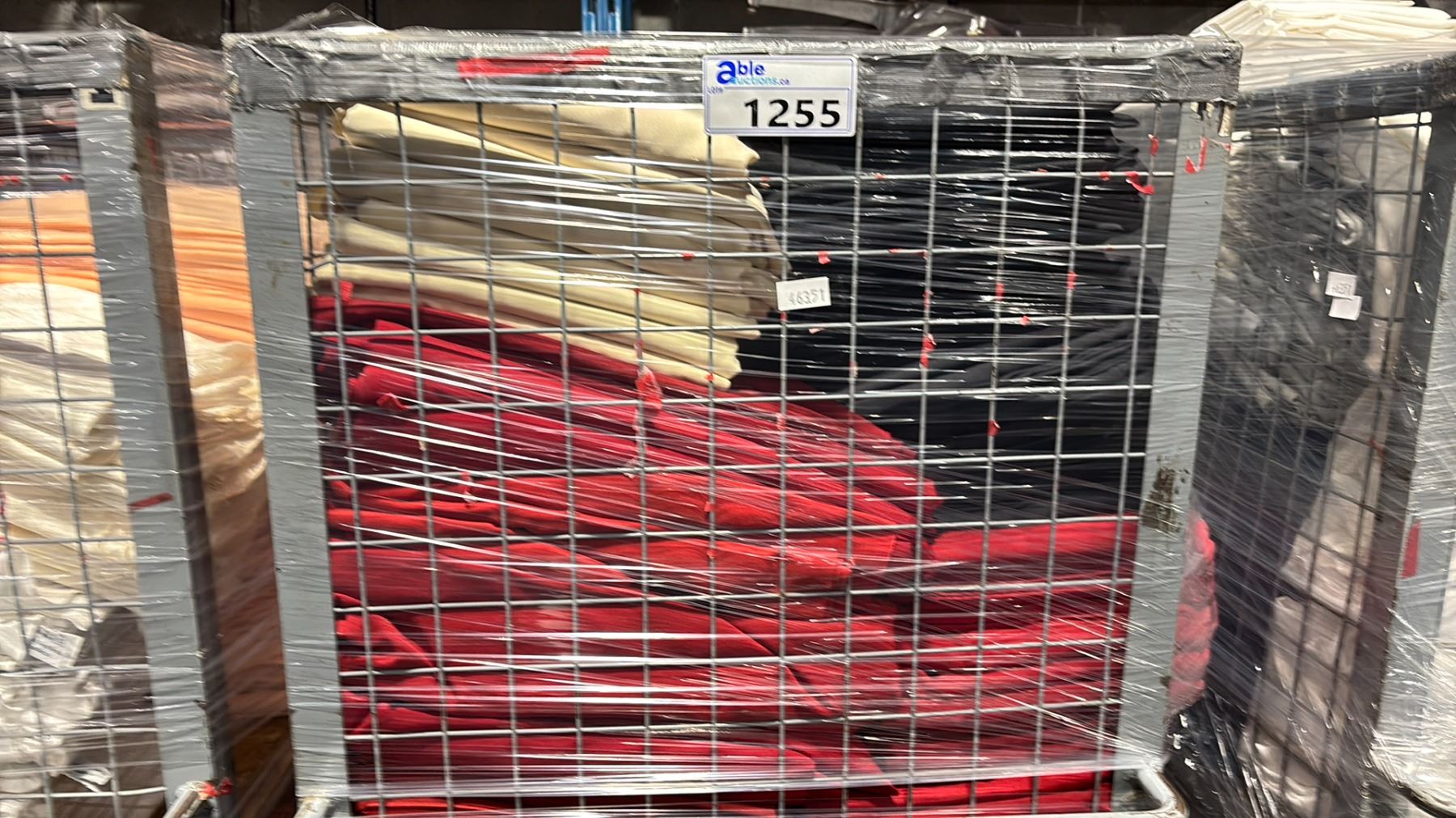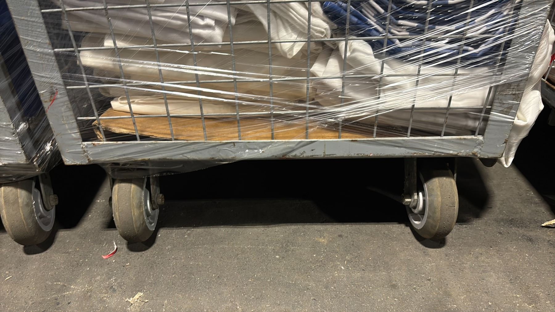 METAL 2 TIER COMMERCIAL MOBILE STORAGE RACK WITH ASSORTED COLOR PROFESSIONAL EVENT / BANQUET TABLE LINENS - RACK SIZE 53"W X 27"D X 62"H *RACK INCLUDED*