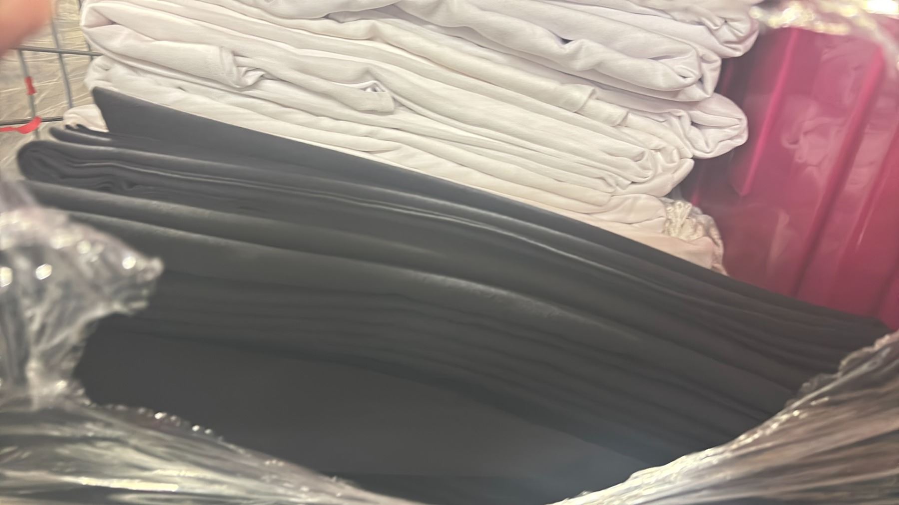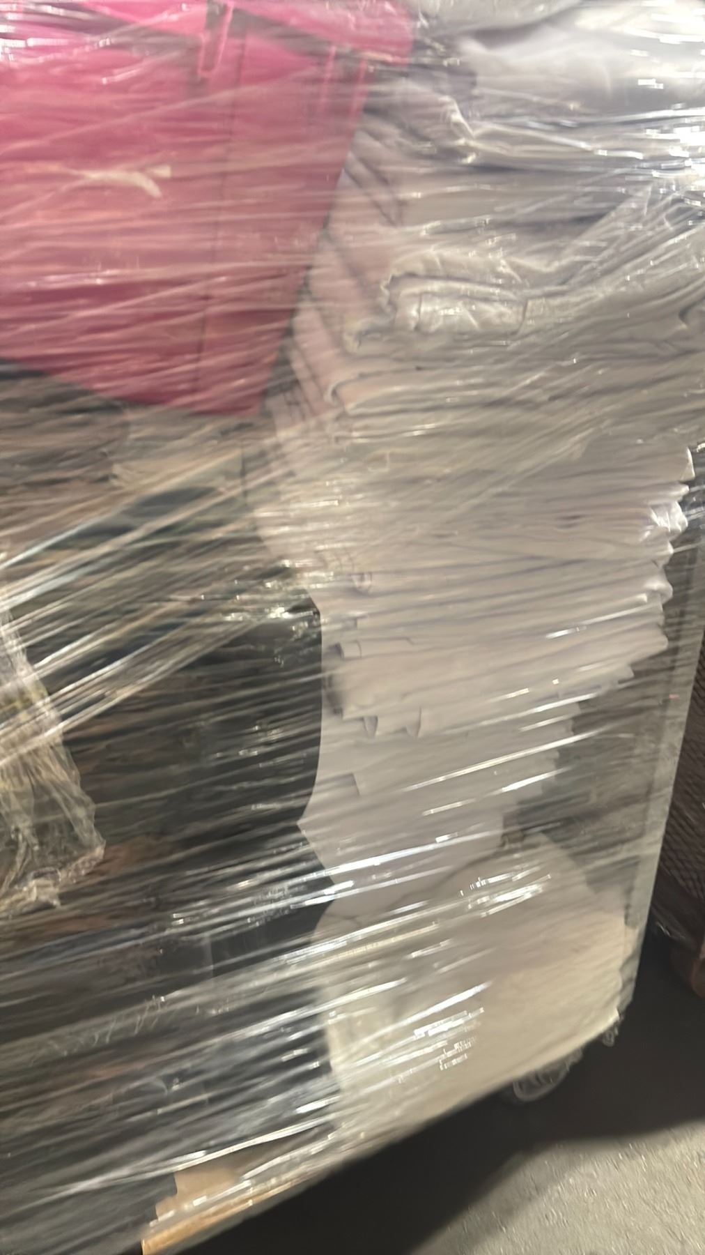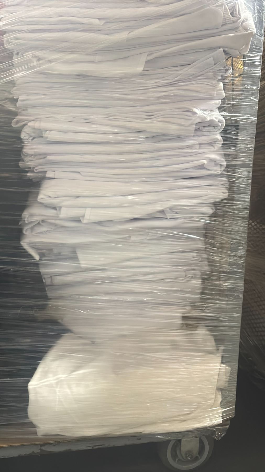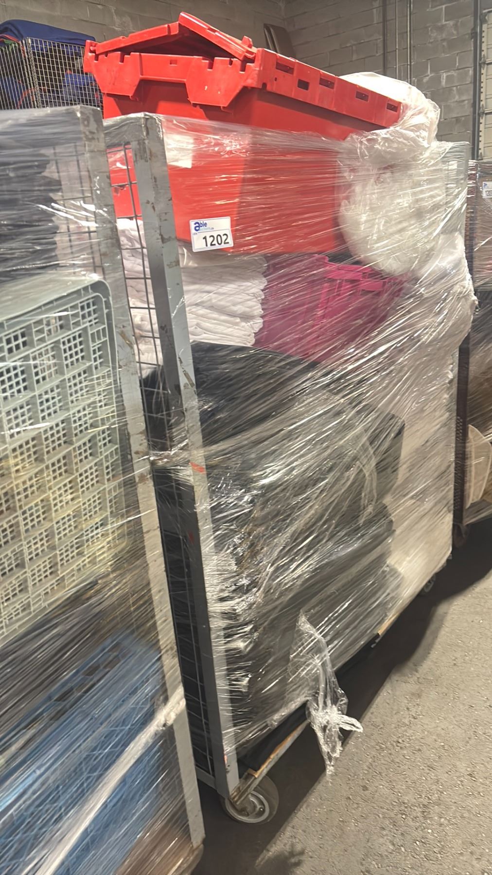 METAL 2 TIER COMMERCIAL MOBILE STORAGE RACK WITH BLACK/WHITE PROFESSIONAL EVENT / BANQUET TABLE LINENS - RACK SIZE 53"W X 27"D X 62"H *RACK INCLUDED*