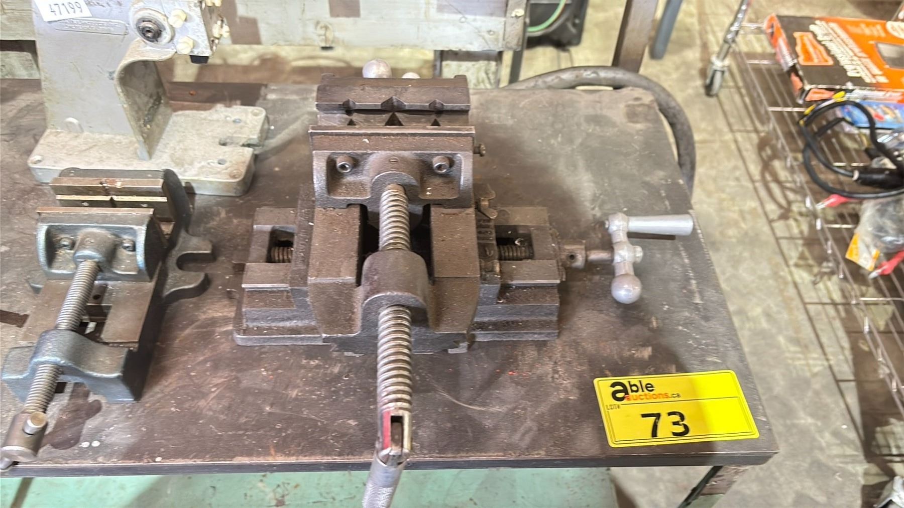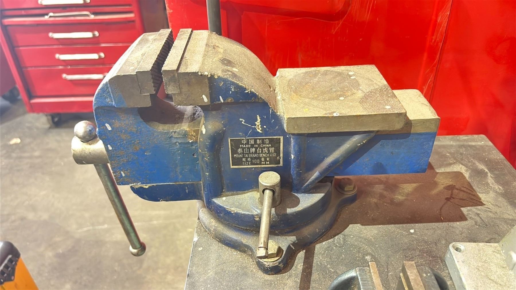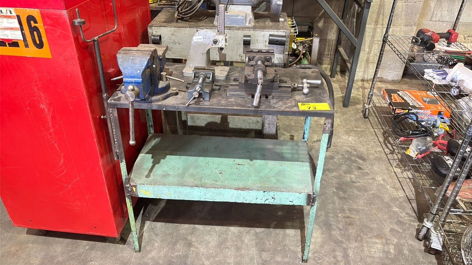 METAL 2 TIER WORK BENCH WITH ATTACHED BENCH VISE, 2 DETACHED BENCH VISES & DETACHED PANA VISE 30" X 15" X 30"H