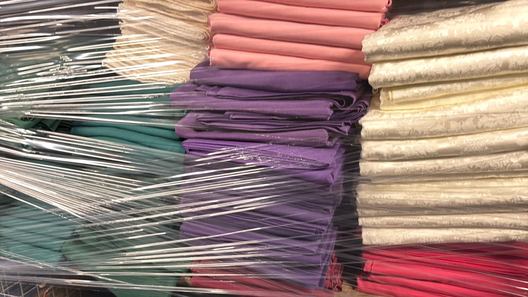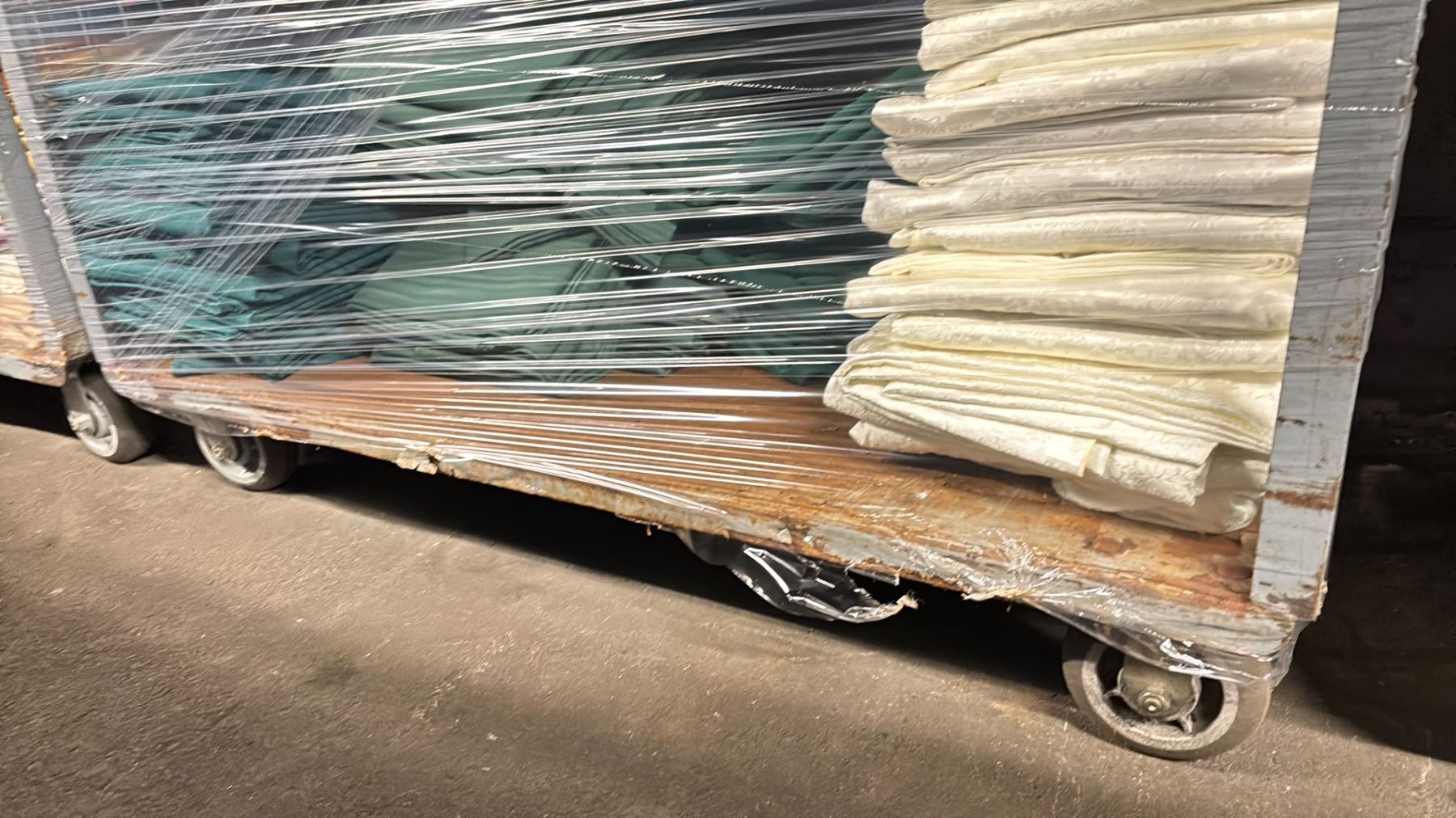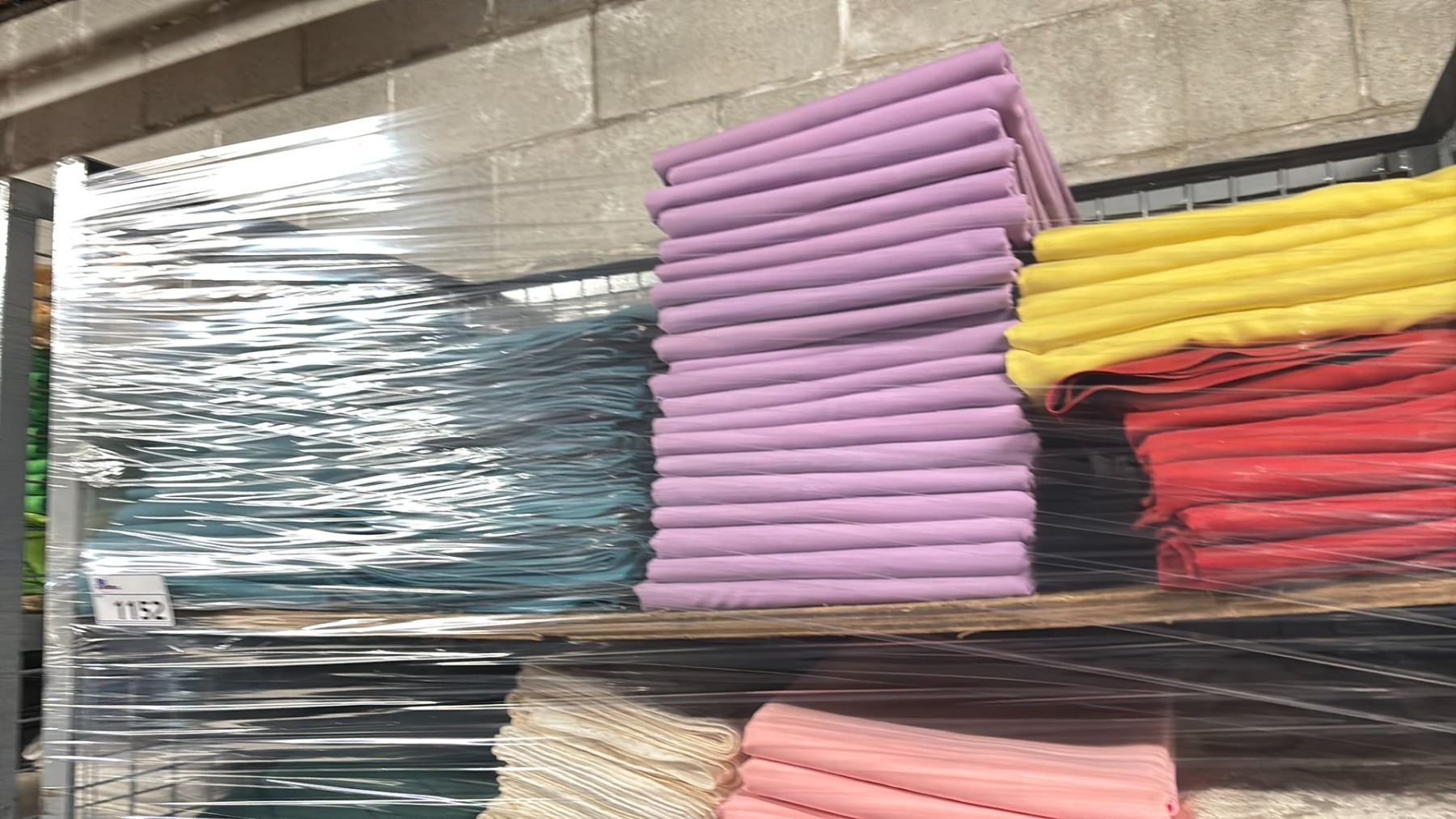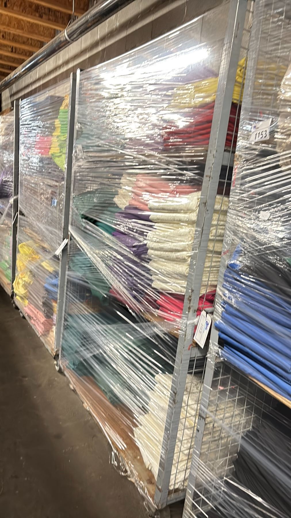 METAL 3 TIER COMMERCIAL MOBILE STORAGE RACK WITH ASSORTED COLOR PROFESSIONAL EVENT / BANQUET TABLE LINENS - RACK SIZE 53"W X 27"D X 81"H *RACK INCLUDED*