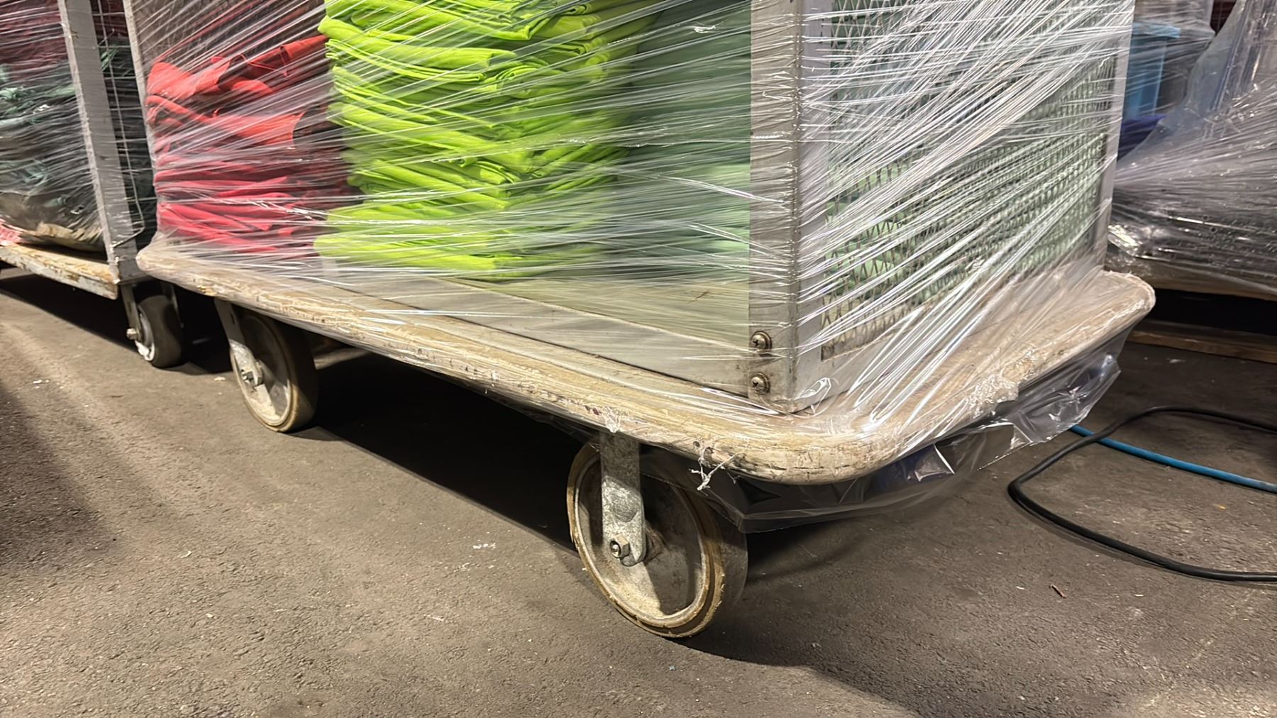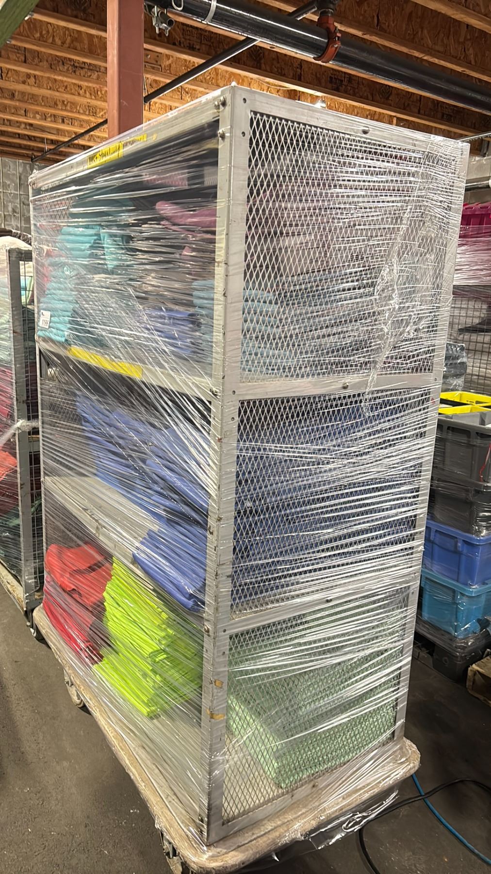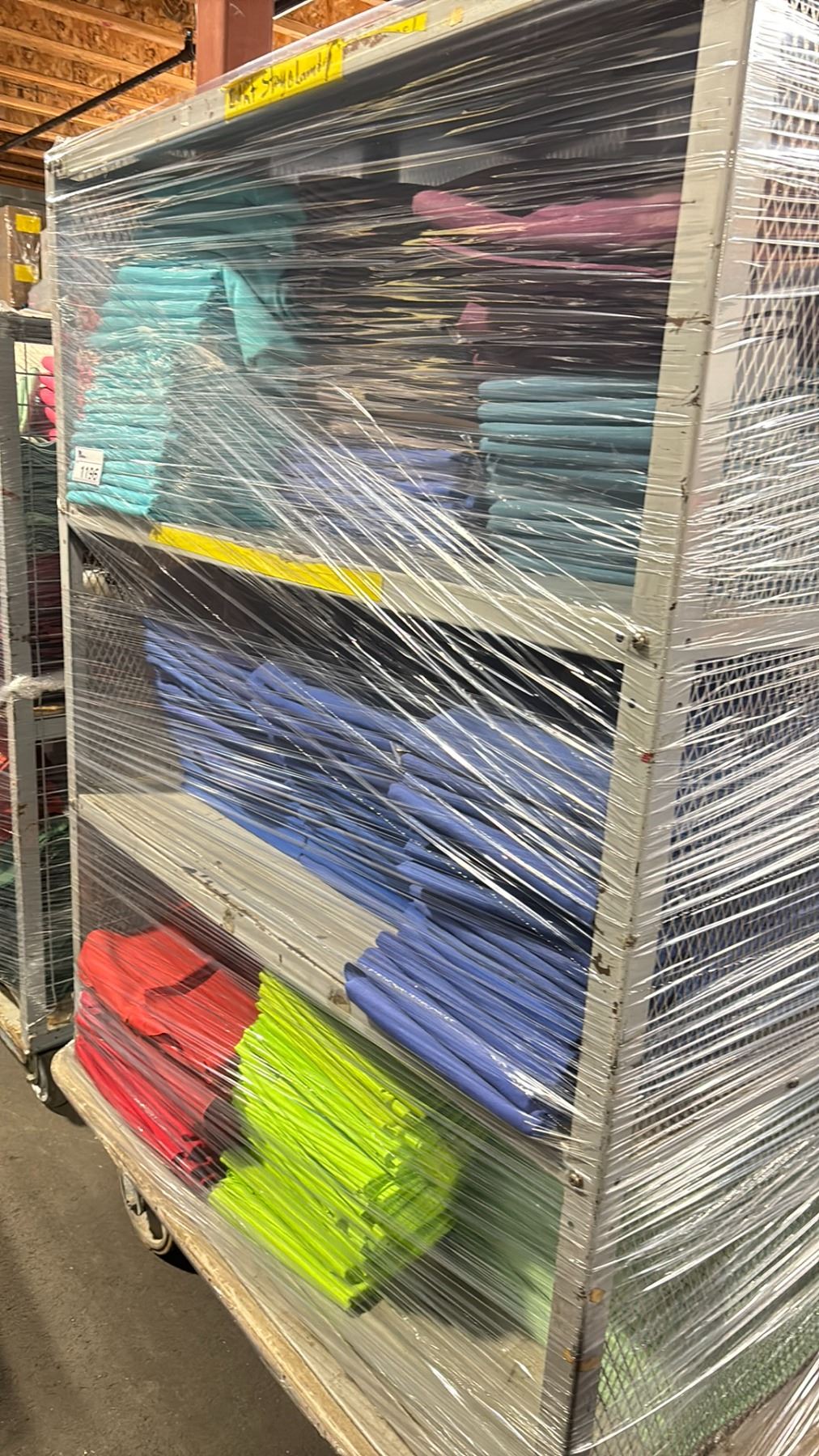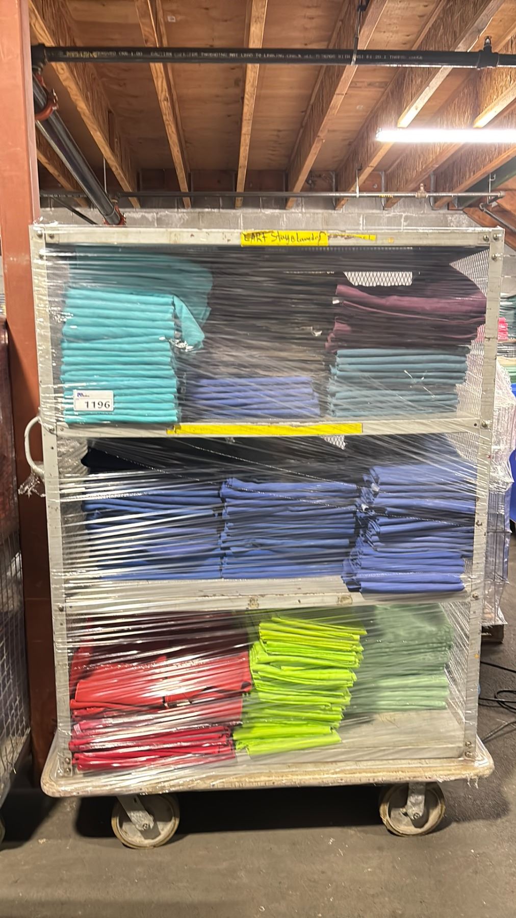 METAL 3 TIER COMMERCIAL MOBILE STORAGE RACK WITH ASSORTED COLOR PROFESSIONAL EVENT / BANQUET TABLE LINENS - RACK SIZE 53"W X 27"D X 71"H *RACK INCLUDED*