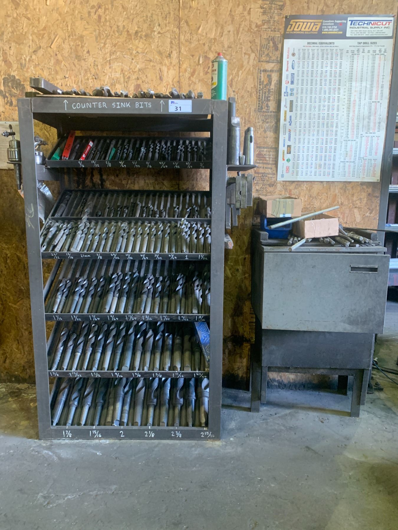 METAL 6 TIER INDUSTRIAL DRILL BIT RACK WITH ASSORTED HEAVY DUTY DRILL BITS, COUNTER SINK BITS, CUCKS, ATTACHMENTS & RACKS WITH ASSORTED RE-BAR & TOOLING