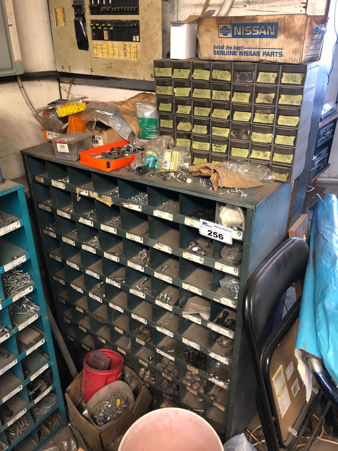METAL 72 BAY PARTS/HARDWARE BIN WITH CONTENTS