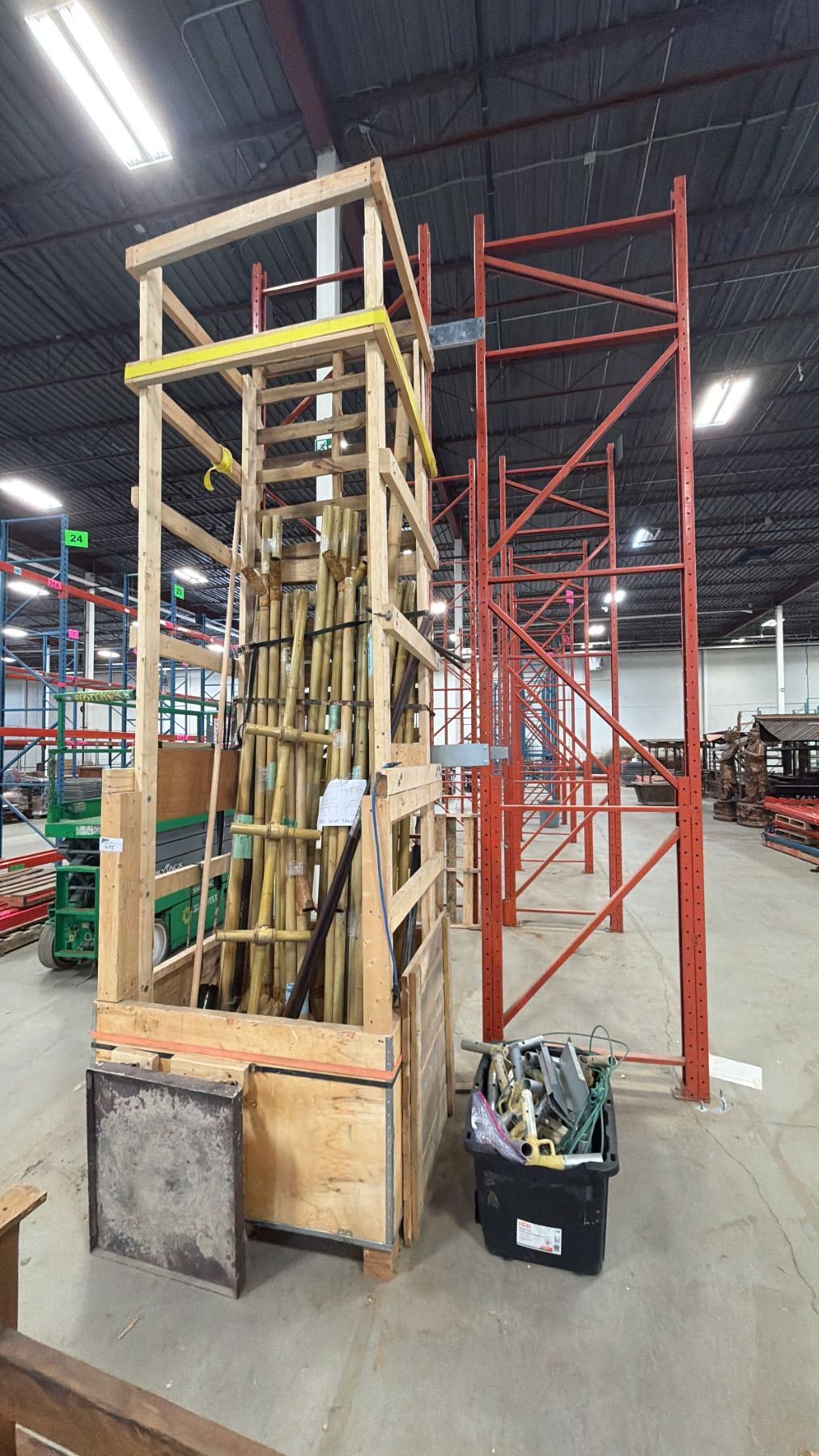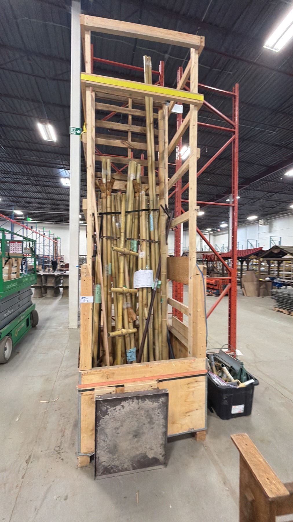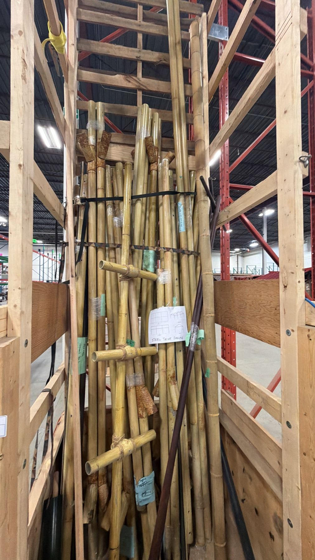 METAL BAMBOO POLES & BIN OF METAL POST CONNECTORS 145"H X 45" W X 45" D