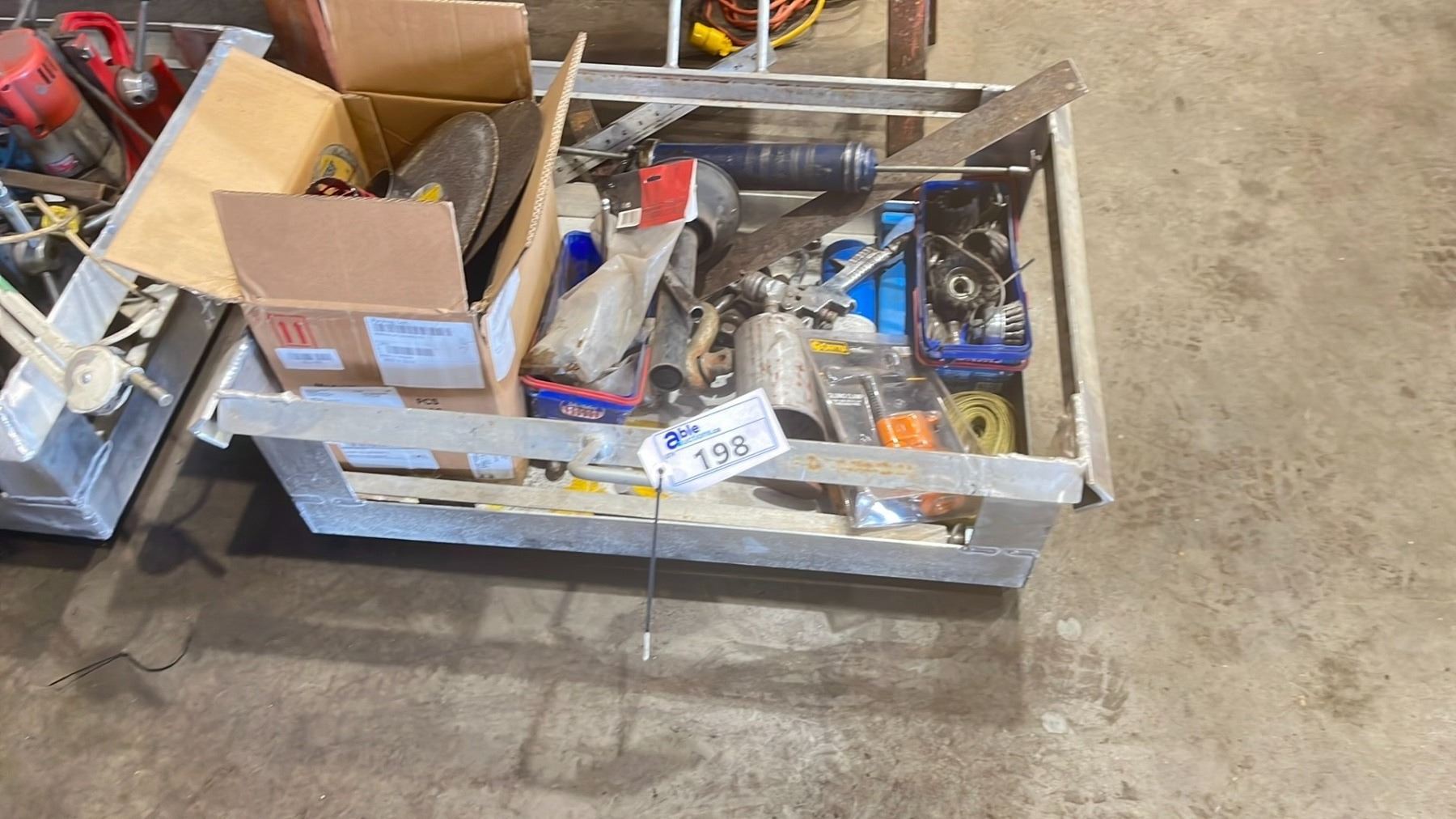 METAL BIN OF ASSORTED TOLLS & HARDWARE