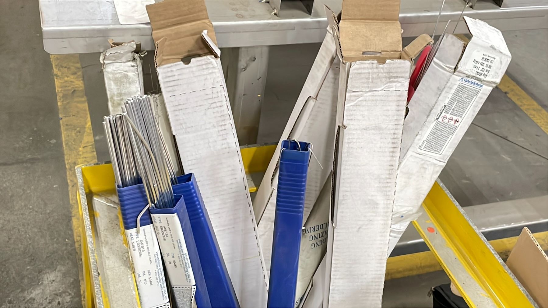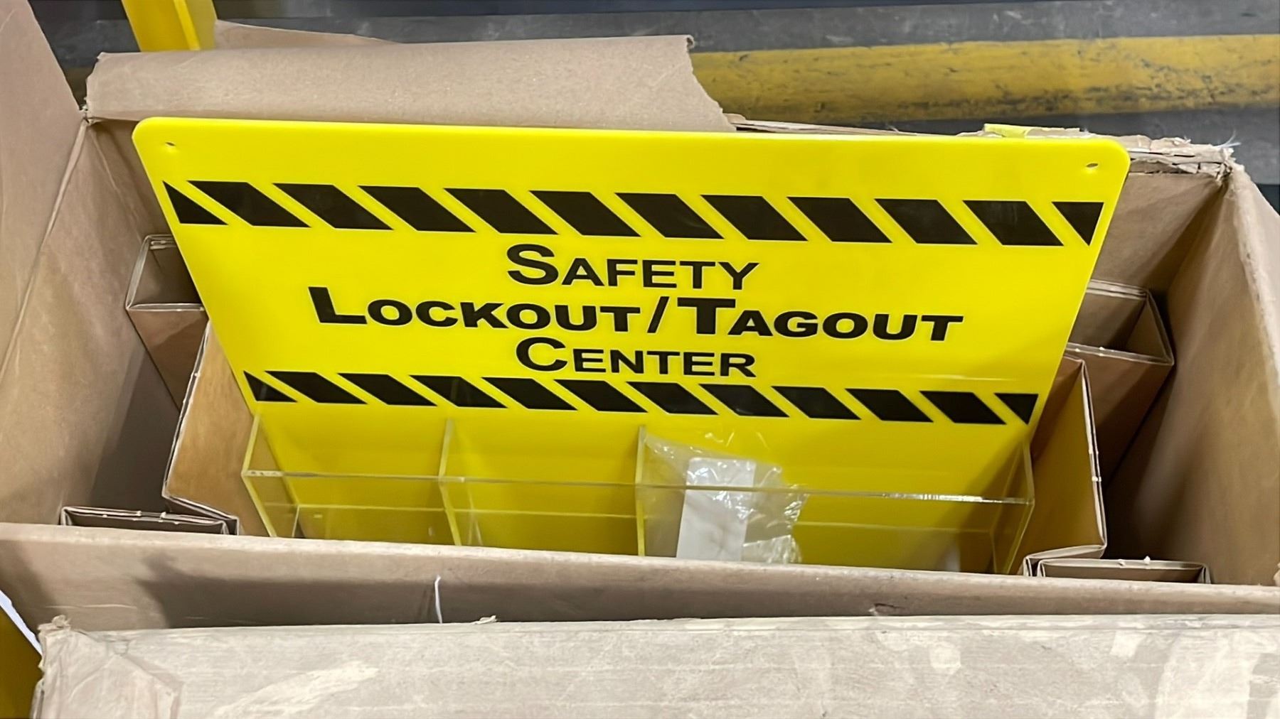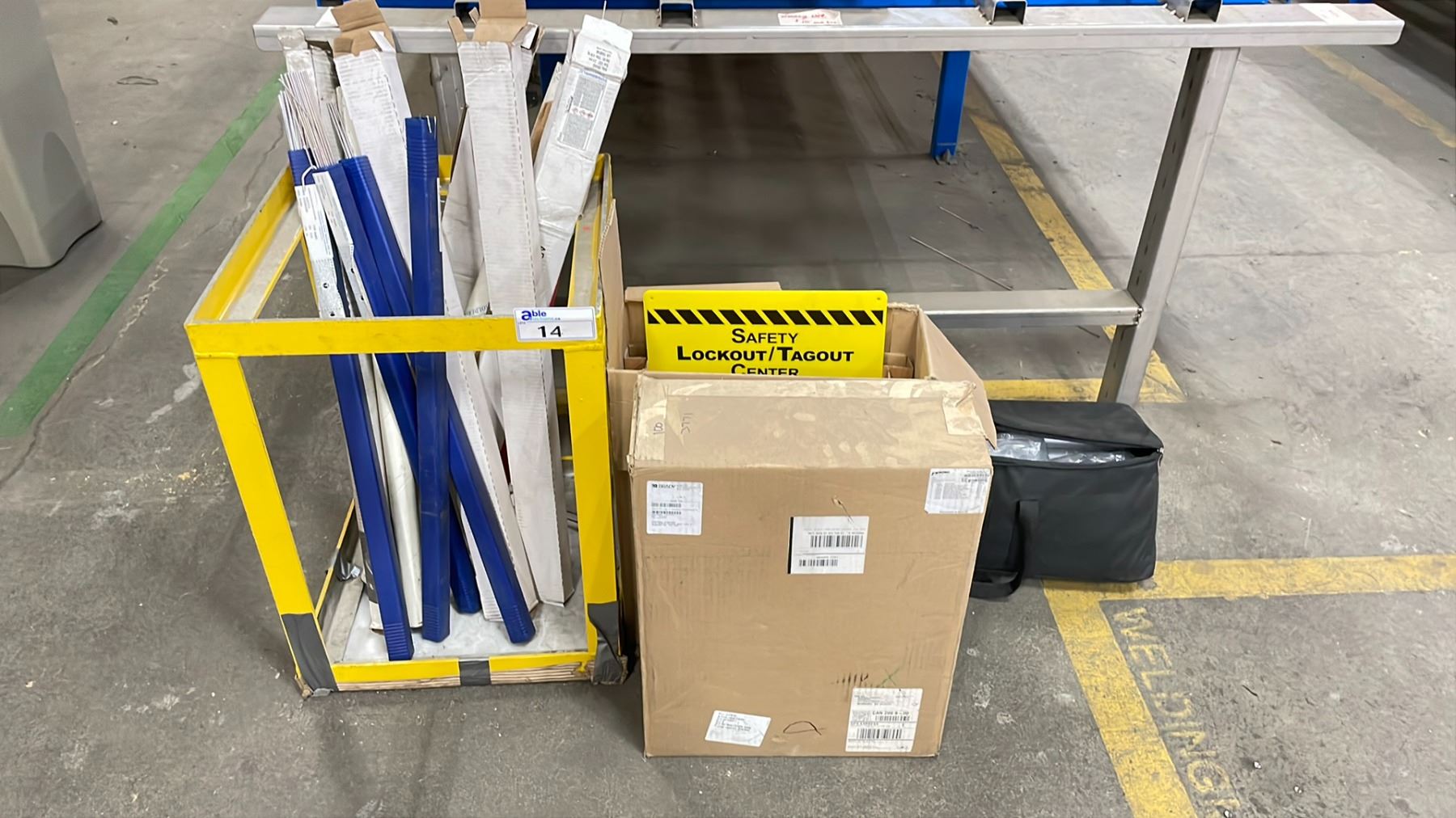 METAL BIN OF ASSORTED WELDING WIRE, LOCKOUT STATIONS AND SIGNBOARD IN BAG