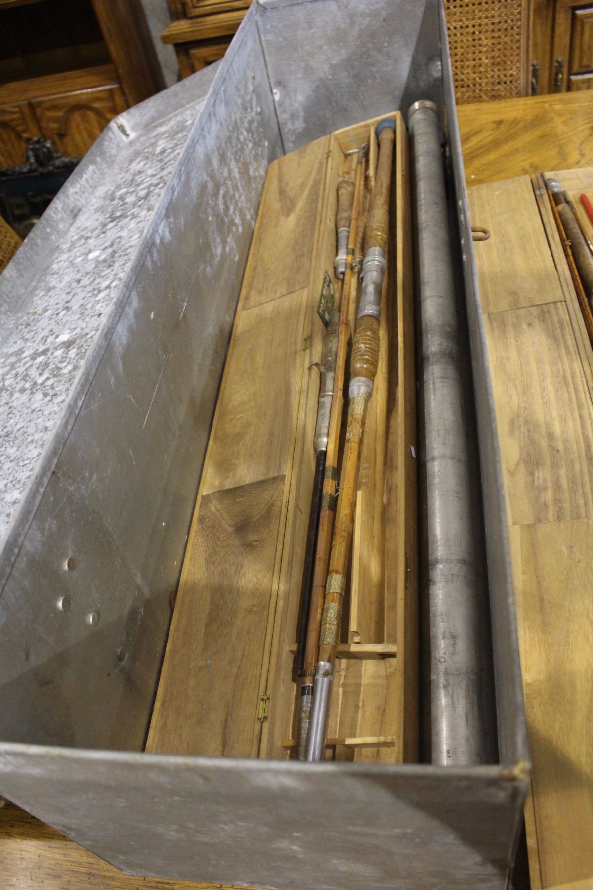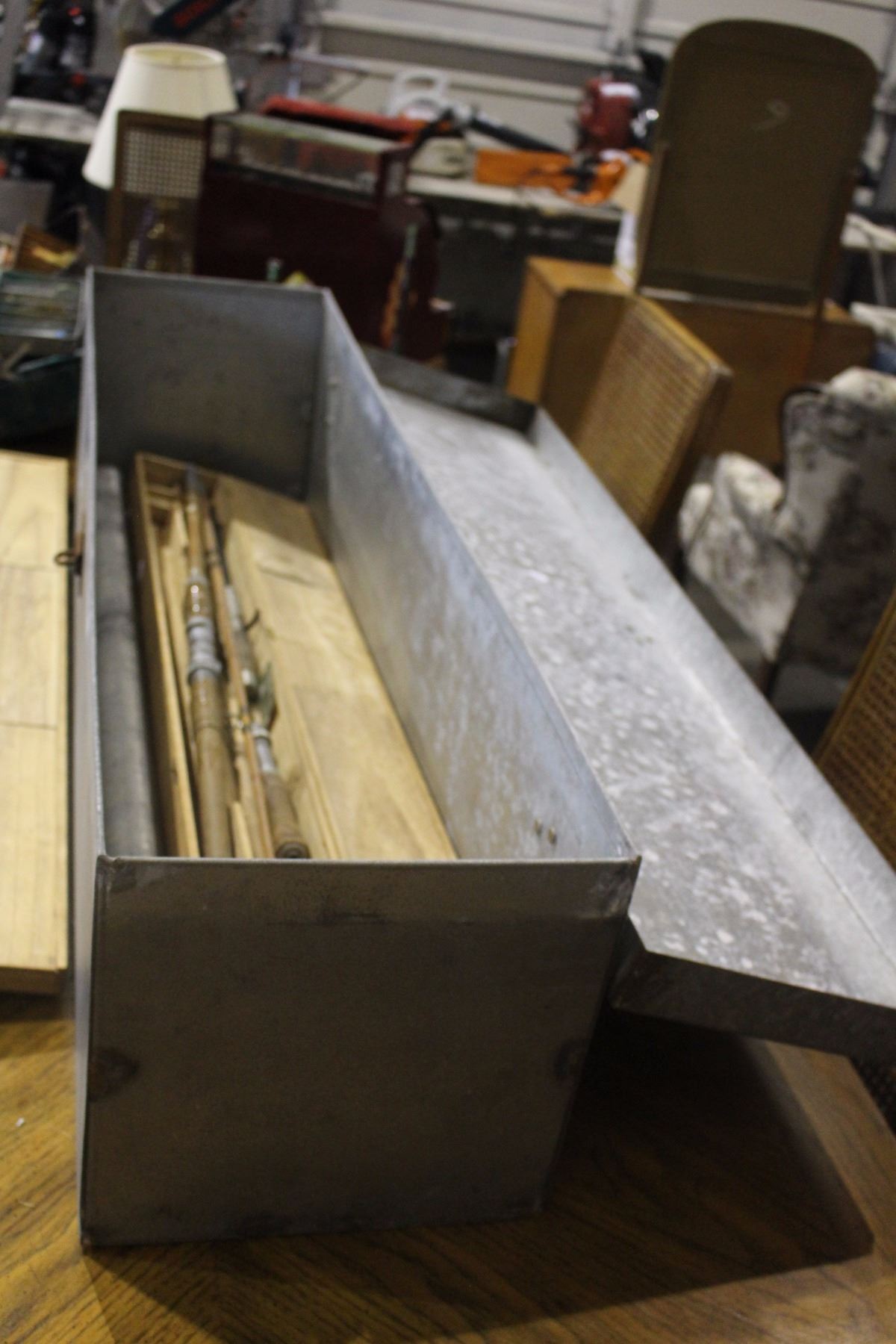 METAL BOX CONTAINING VINTAGE FISHING RODS, REELS, AND MORE