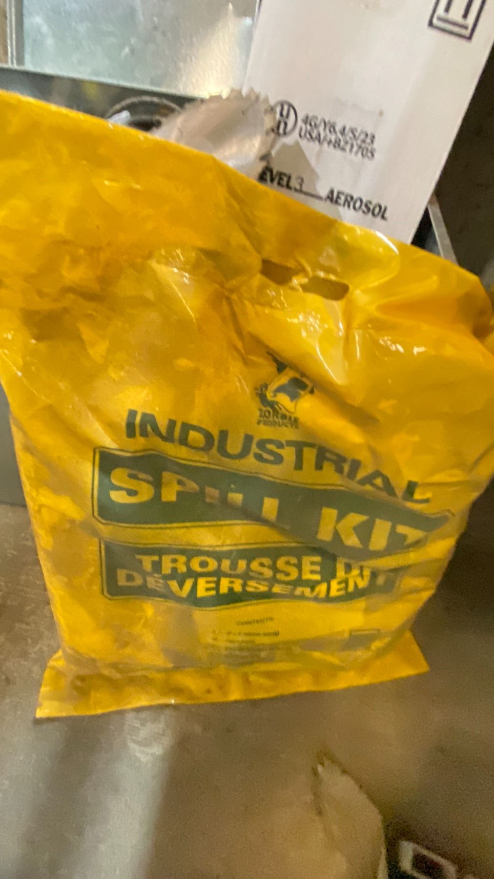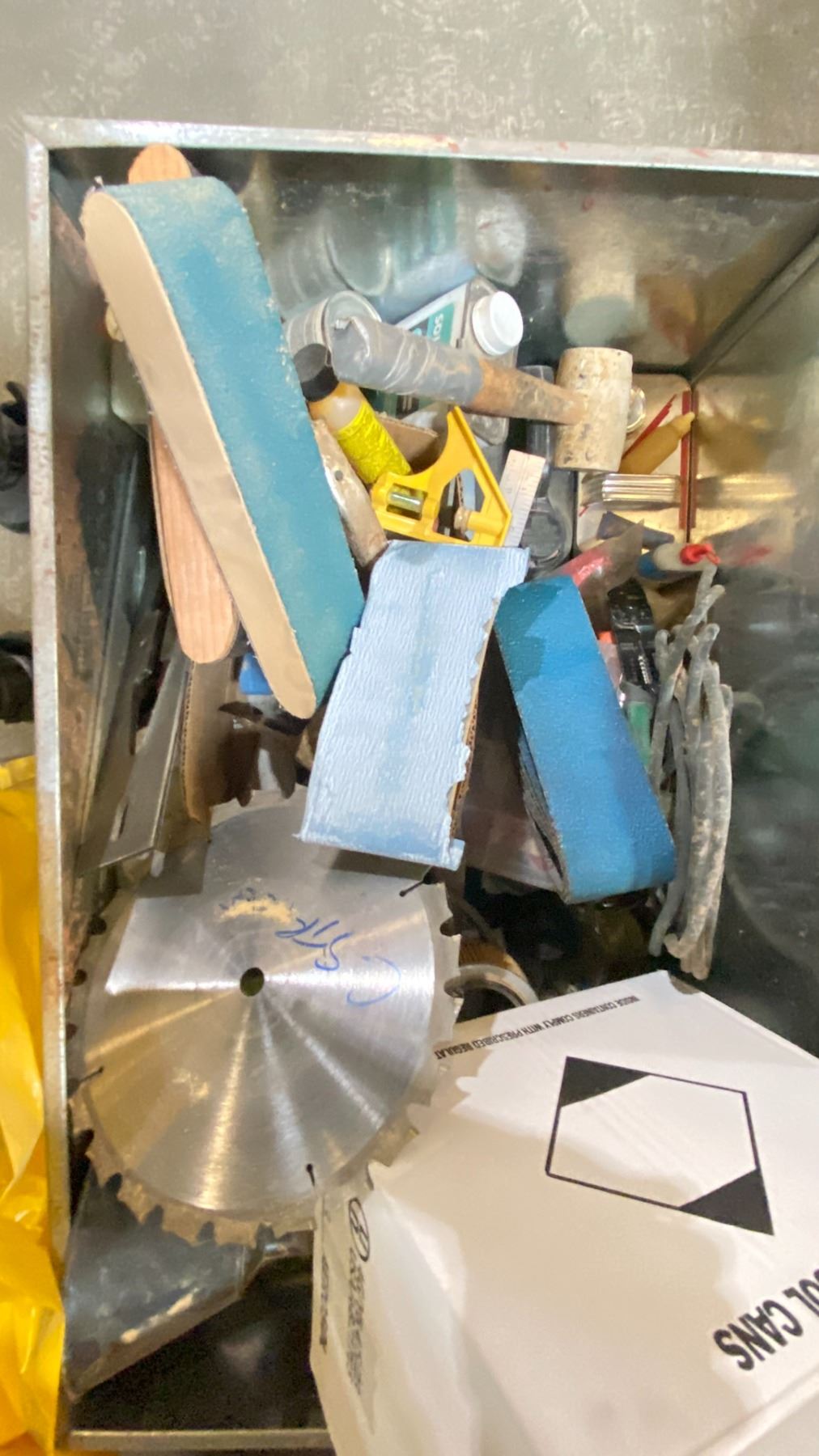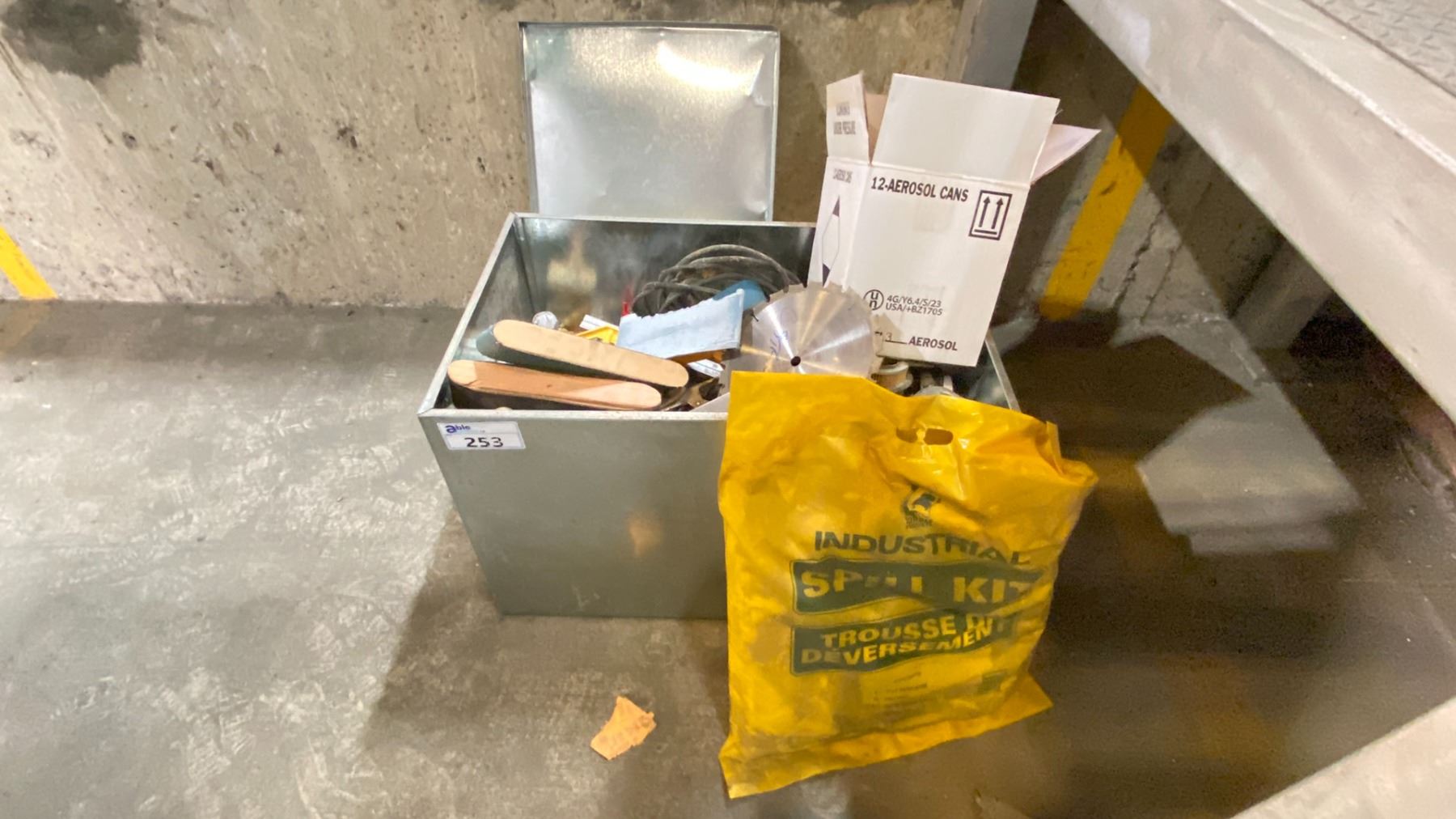 METAL BOX OF ASSORTED CHEMICALS, TOOLS, PARTS, SCRAP, SPILL KIT & AEROSOL SPRAY ADHESIVE