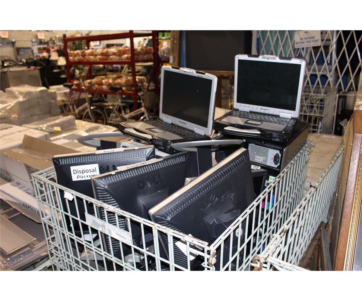 METAL CAGE PALLET FILLED WITH ASSORTED COMPUTERS; PANASONIC TUFF BOOKS, COMPUTER TOWERS, MONITORS, ETC *METAL CAGE NOT INCLUDED*