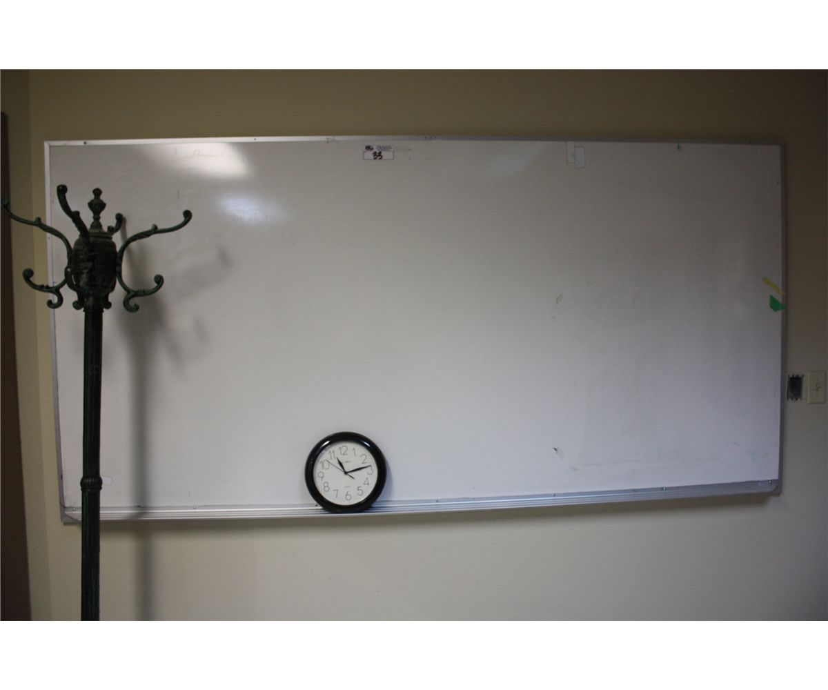 METAL COAT RACK, LARGE WHITEBOARD AND CLOCK