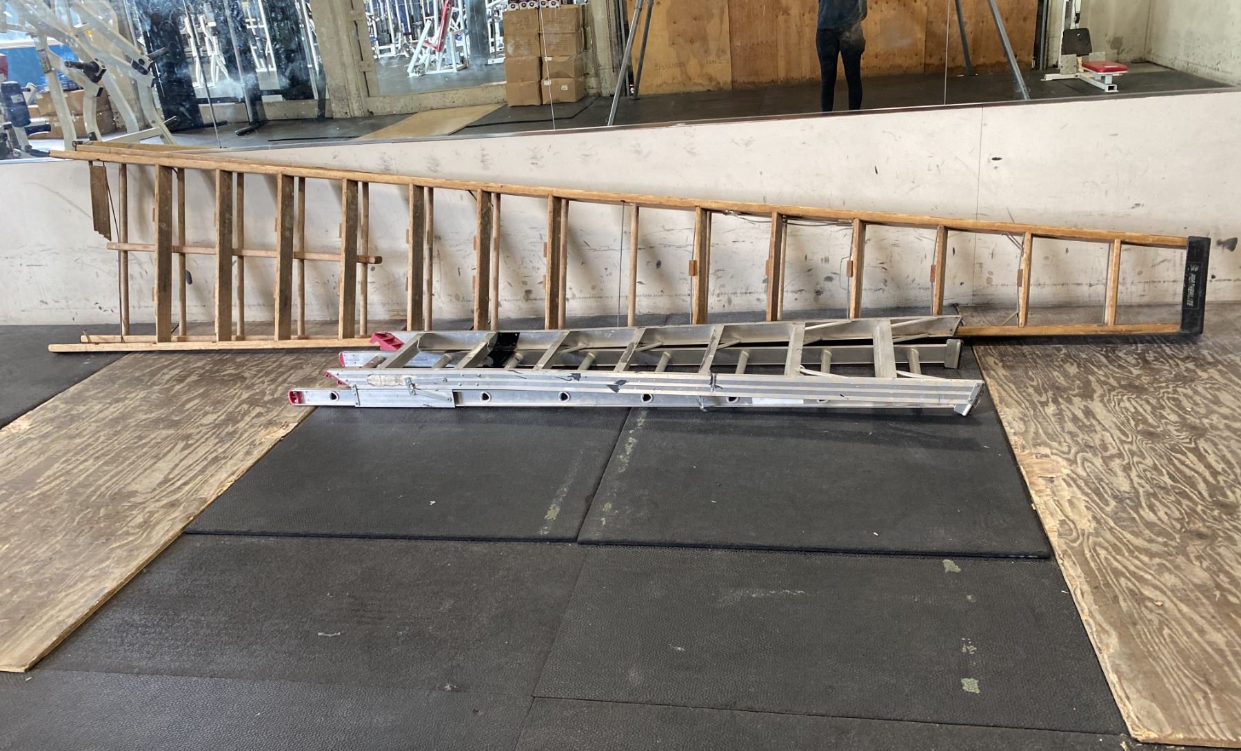 METAL CONVERTIBLE STEP/EXTENSION LADDER AND 16' WOODEN LADDER (NEEDS SOME REPAIRS)