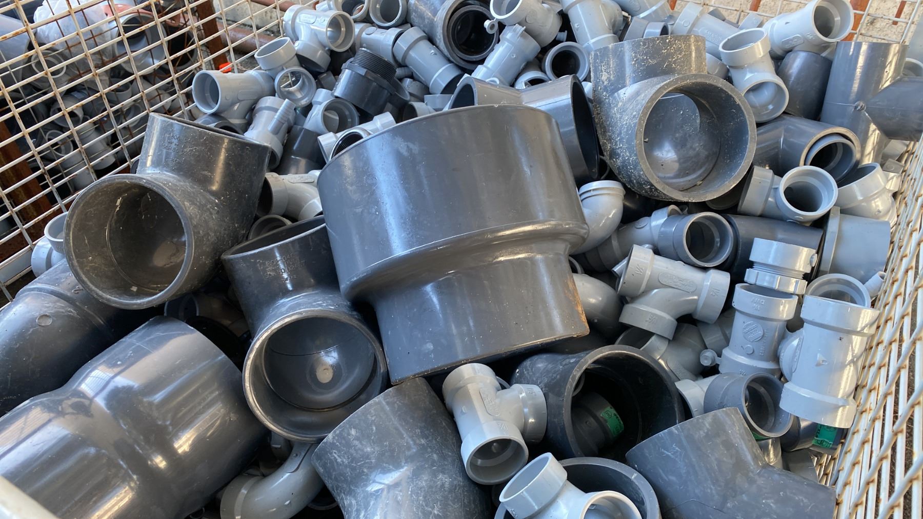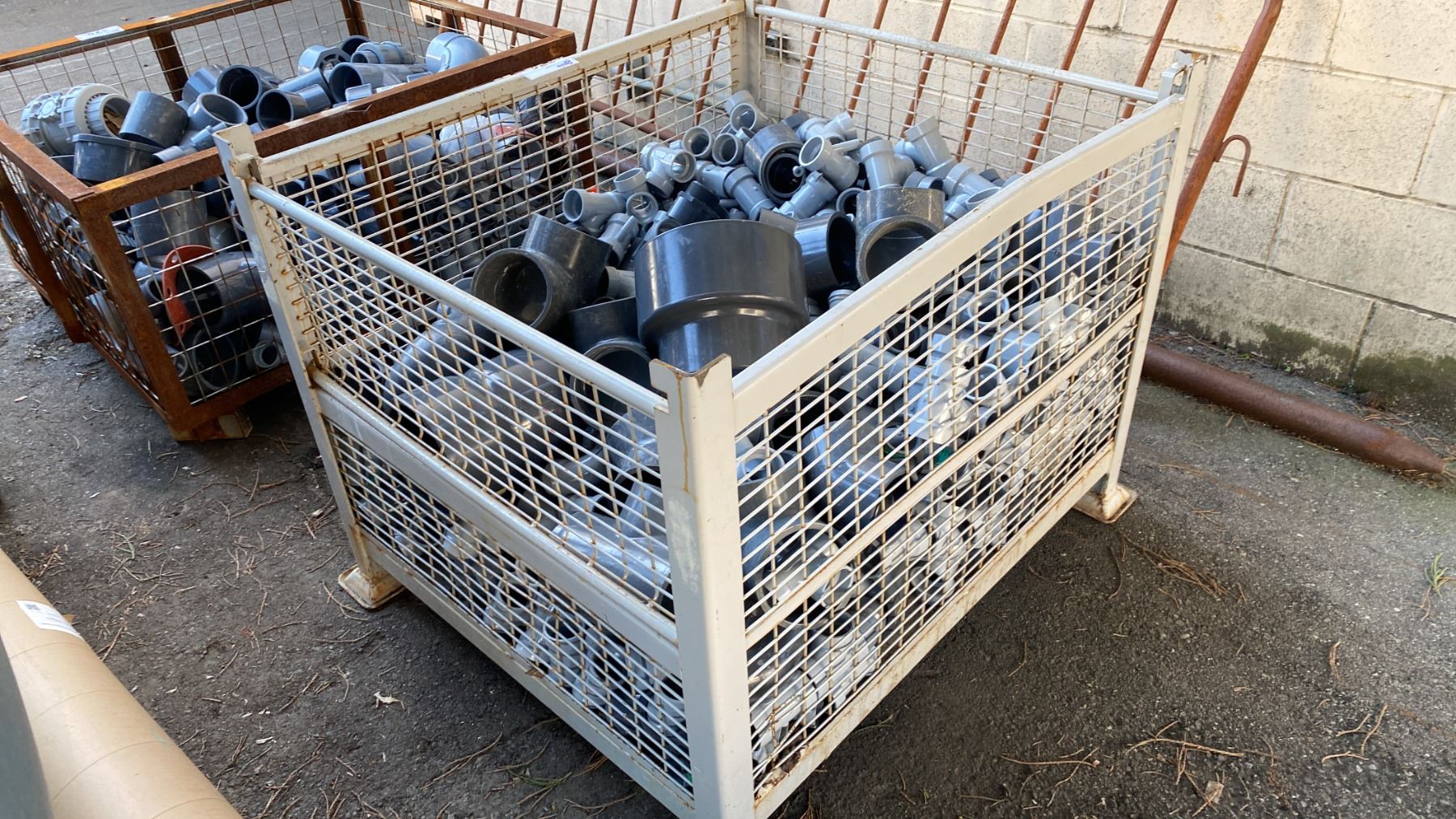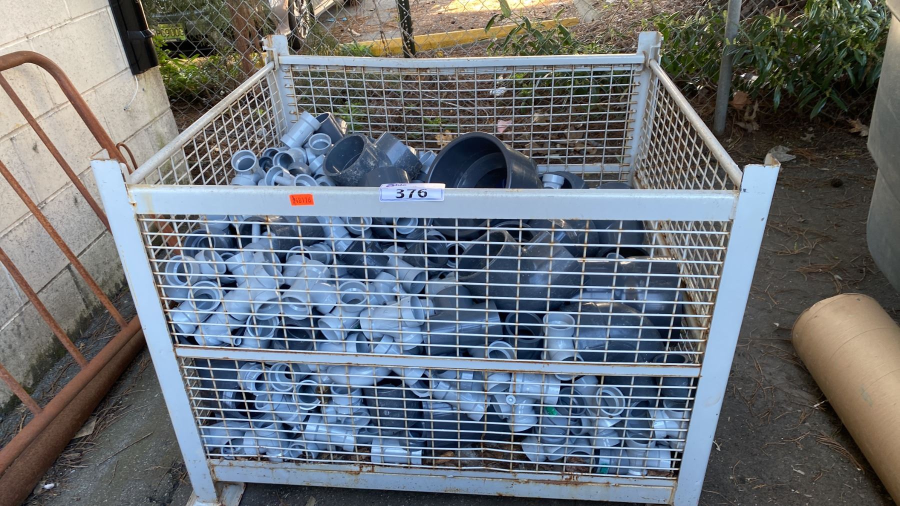 METAL CRATE OF ASSORTED PVC/PLASTIC PLUMBING HARDWARE *CRATE INCLUDED*
