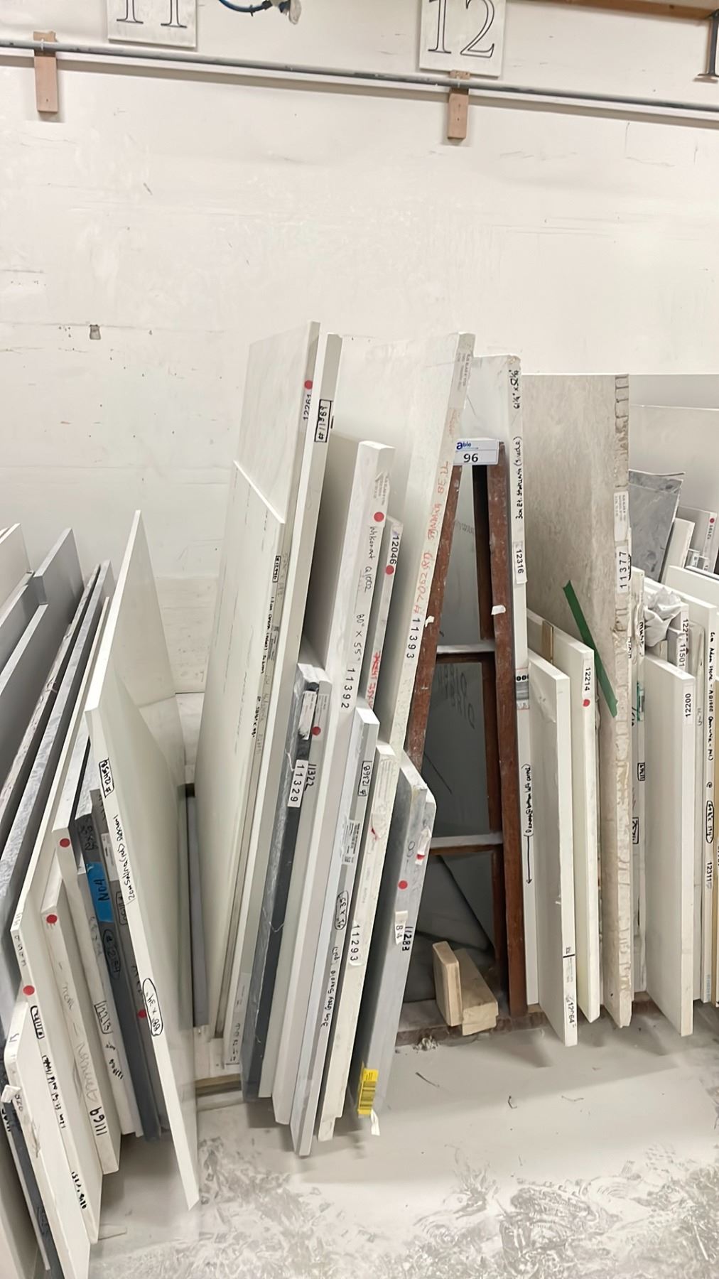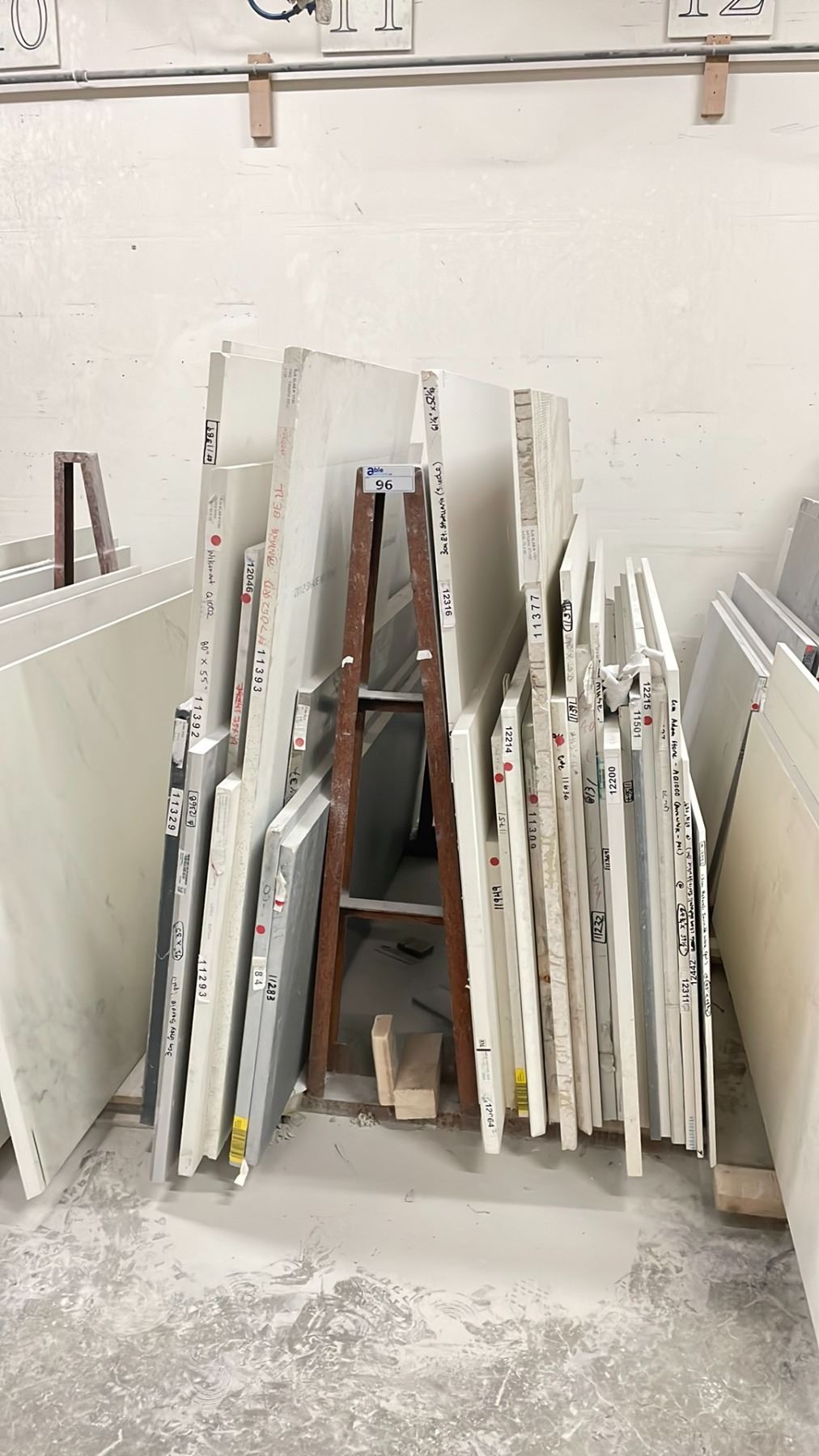 METAL DUAL A-FRAME RACK WITH ASSORTED COMMERCIAL COUNTER TOP STONE SLAB MATERIAL