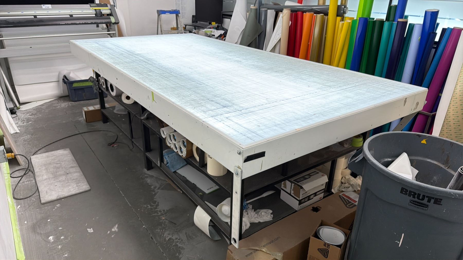 METAL FAMED ILLUMINATED INDUSTRIAL LAYOUT TABLE APPROX 120X60X36" *REQUIRES TOOLS & PROFESSIONAL TO DISMANTLE*