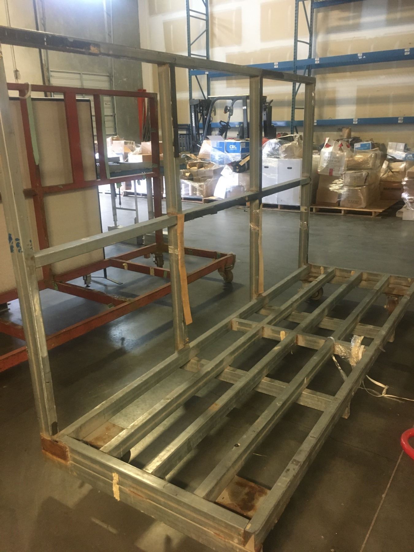 METAL FRAME 4 WHEEL MATERIAL STORAGE RACK - APPROX 10FT ACROSS X 6FT HIGH (GREY)