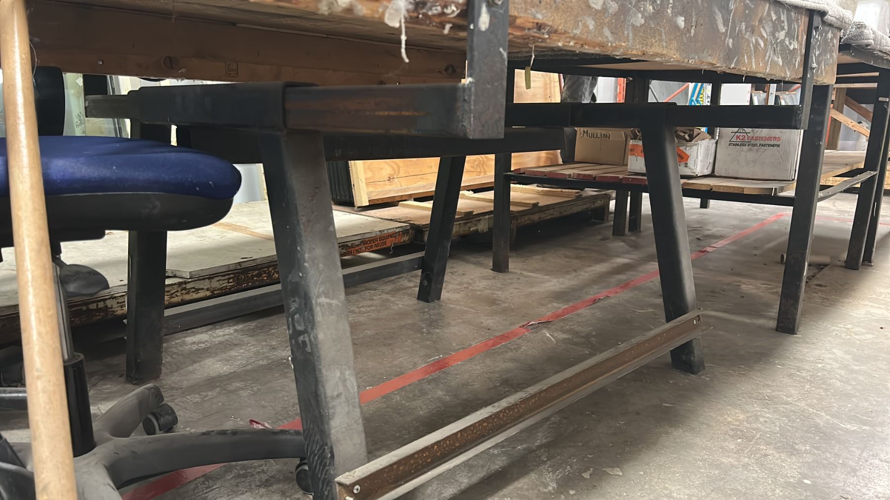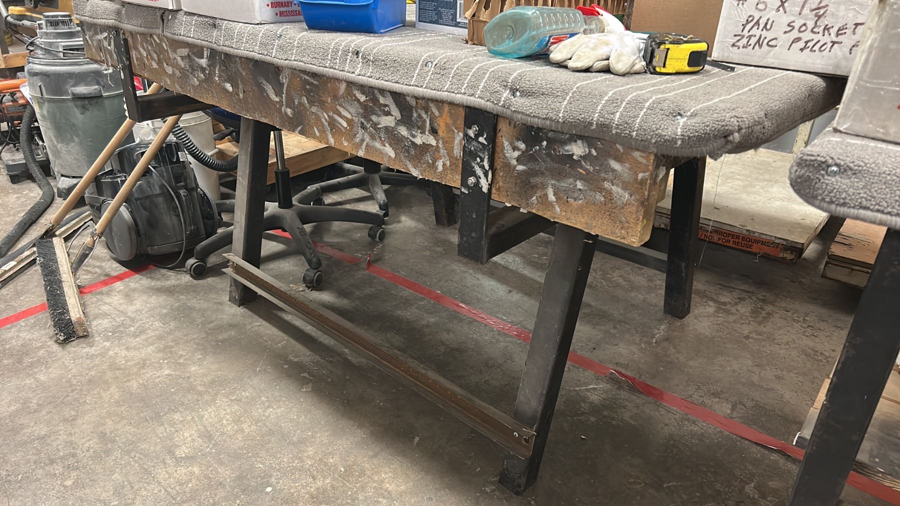 METAL FRAMED WORK BENCH 63"X48" PLYWOOD TOP WITH CARPET COVER - NO CONTENTS