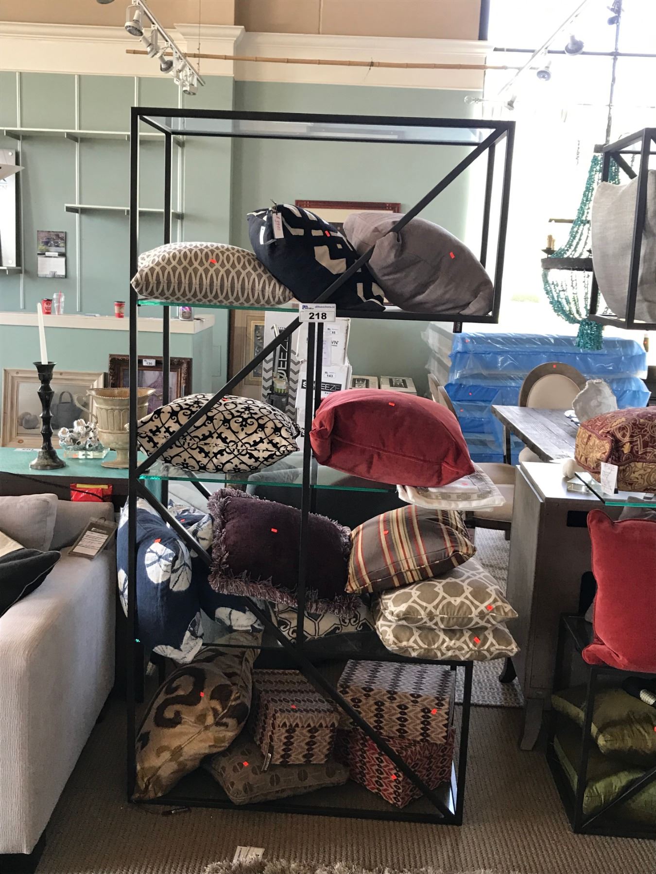 METAL & GLASS MODERN SHELVING UNIT WITH ASSORTED DECOR ITEMS & THROW PILLOWS