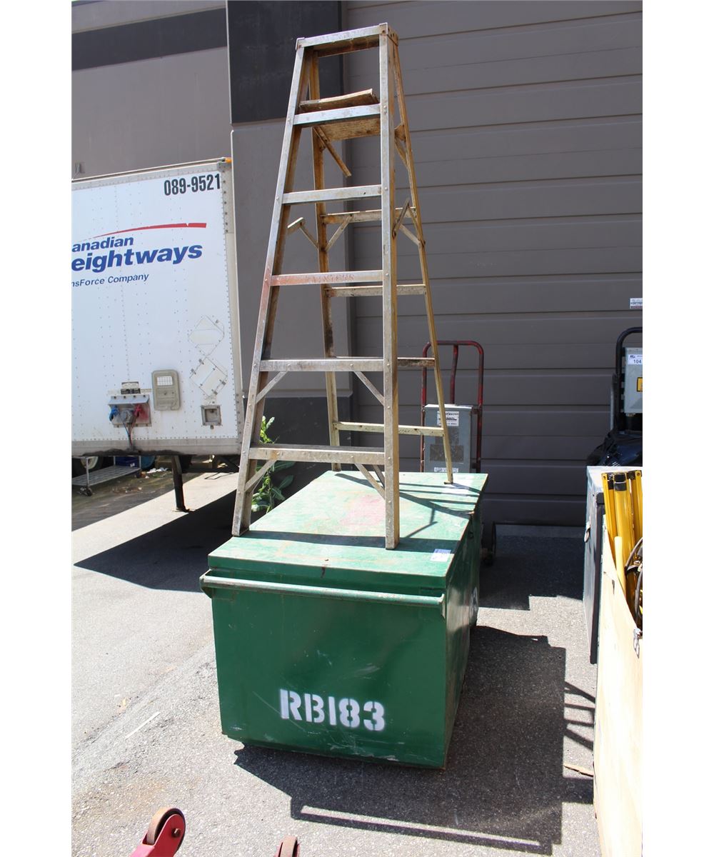 METAL JOB SITE TOOL STORAGE BOX, CONTENTS AND ALUMINUM LADDER