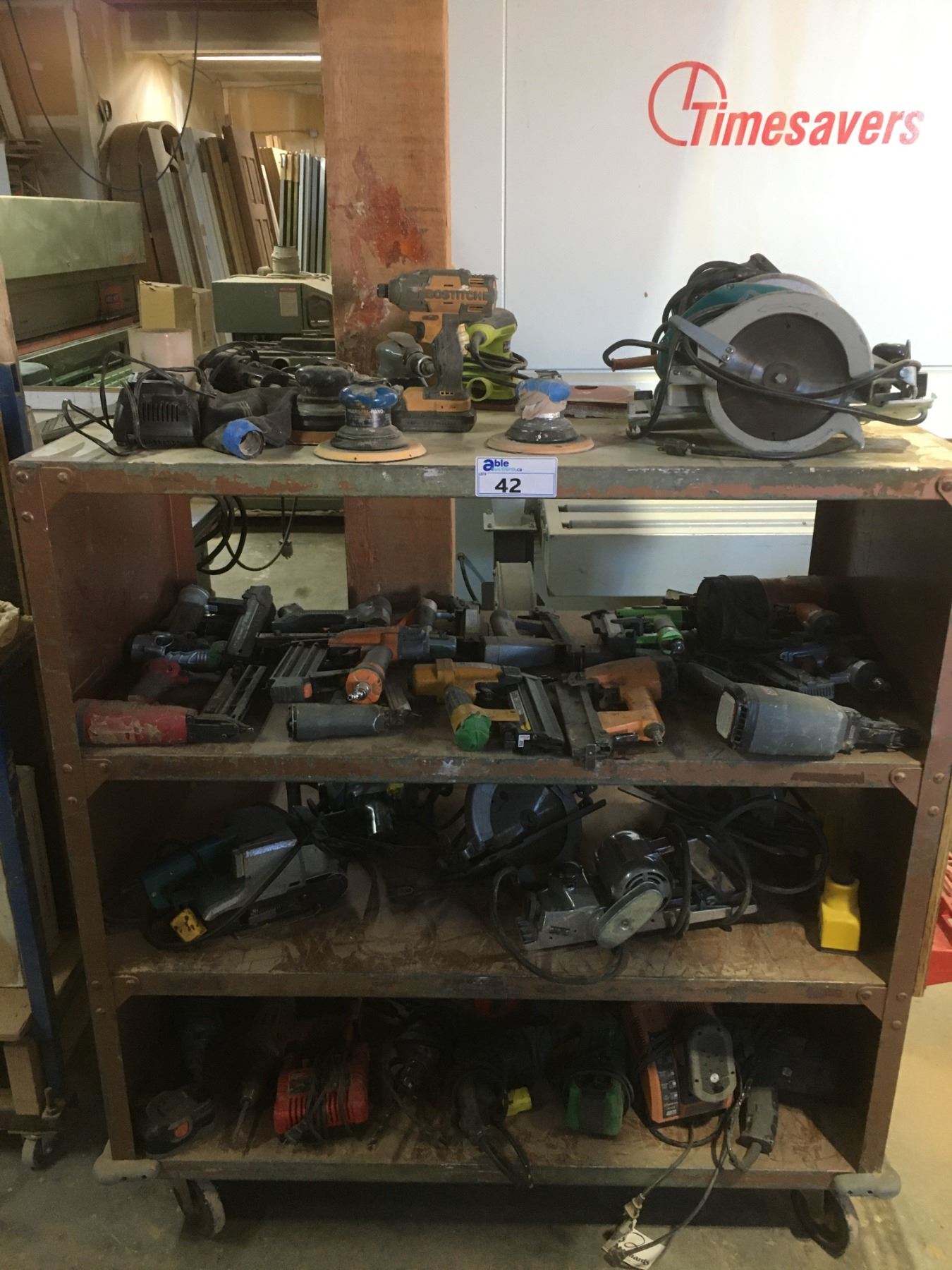 METAL MOBILE SHELF UNIT WITH CONTENTS- (4) SHELVES OF ASSORTED POWER TOOLS