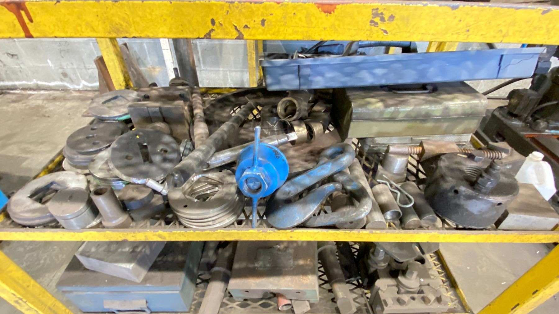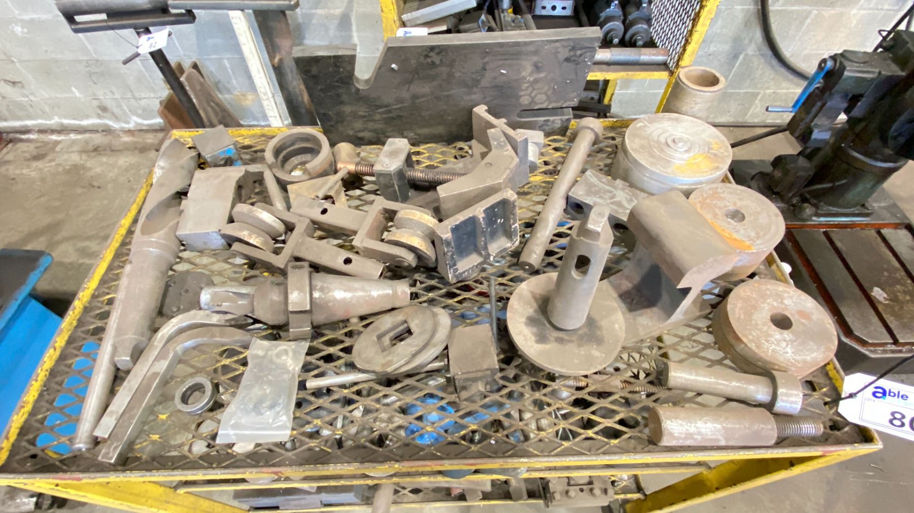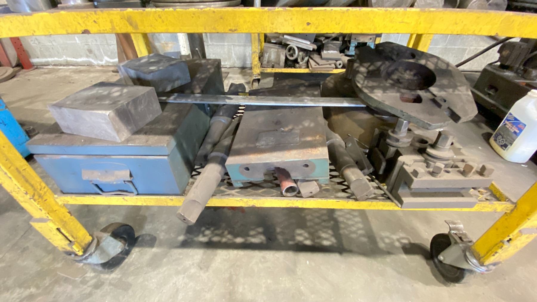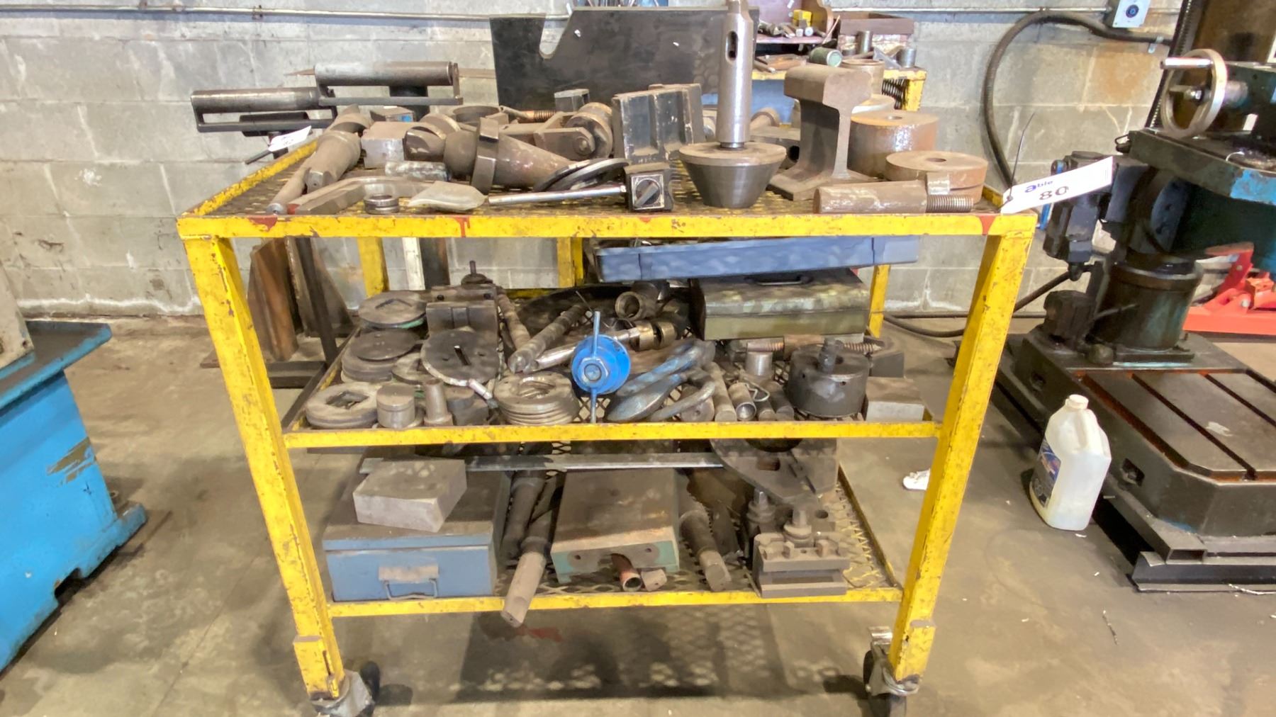 METAL MOBILE SHOP TABLE/CART WITH ASSORTED INDUSTRIAL MACHINERY PARTS