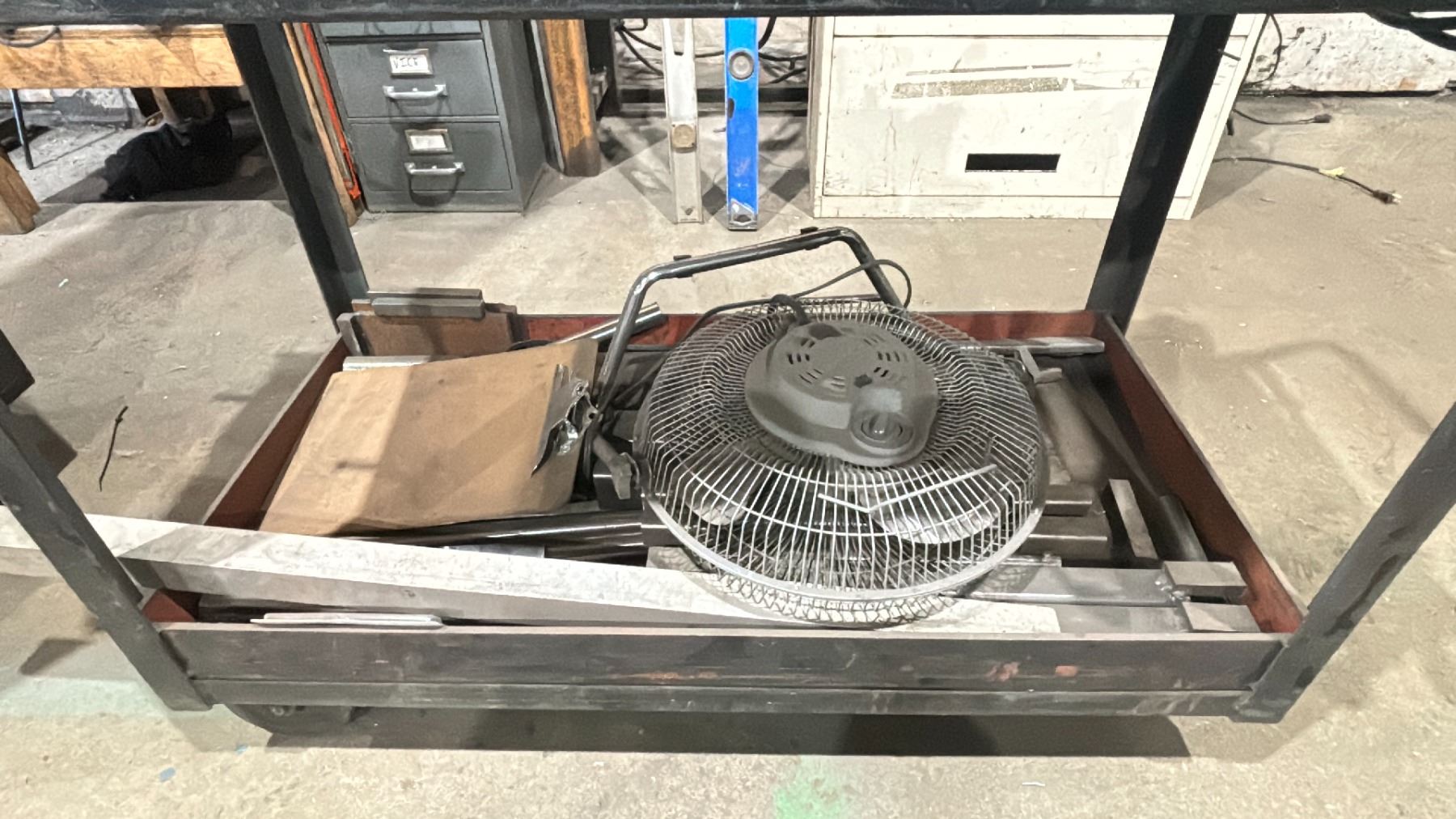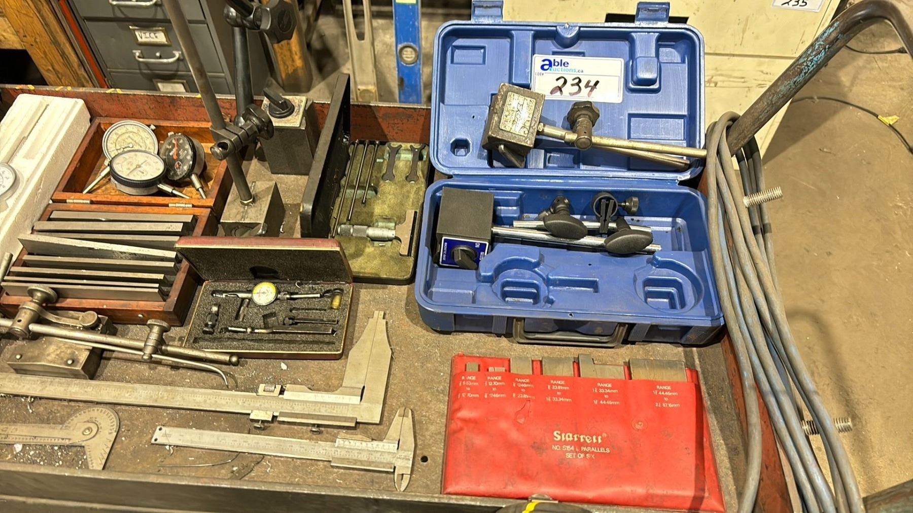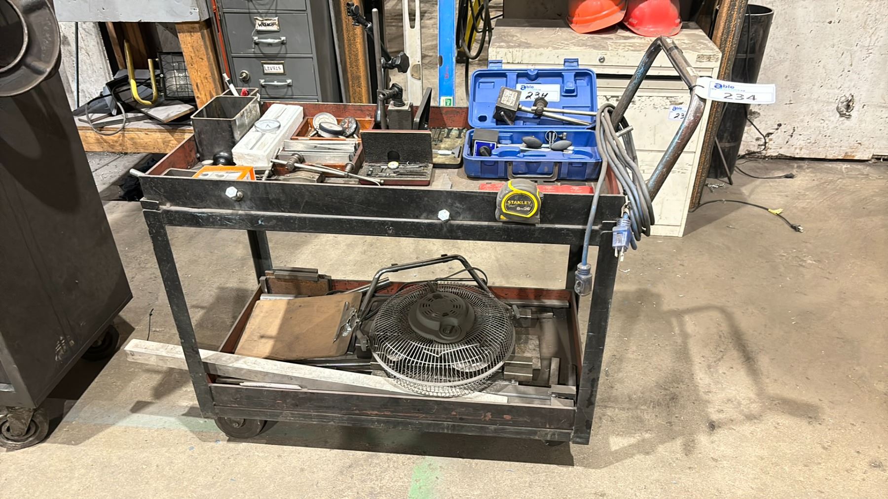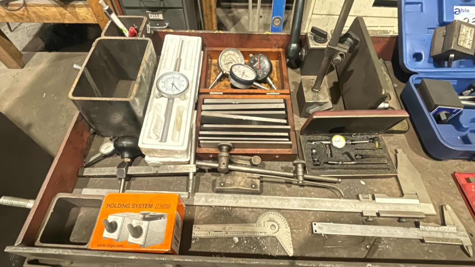 METAL MOBILE WORK CART WITH ASSORTED PRECISION MACHINIST ITEMS-GAUGES, CALIPERS, MAGNETIC DIAL BASES AND MISCELLANEOUS