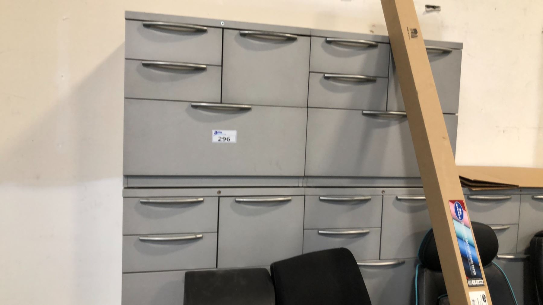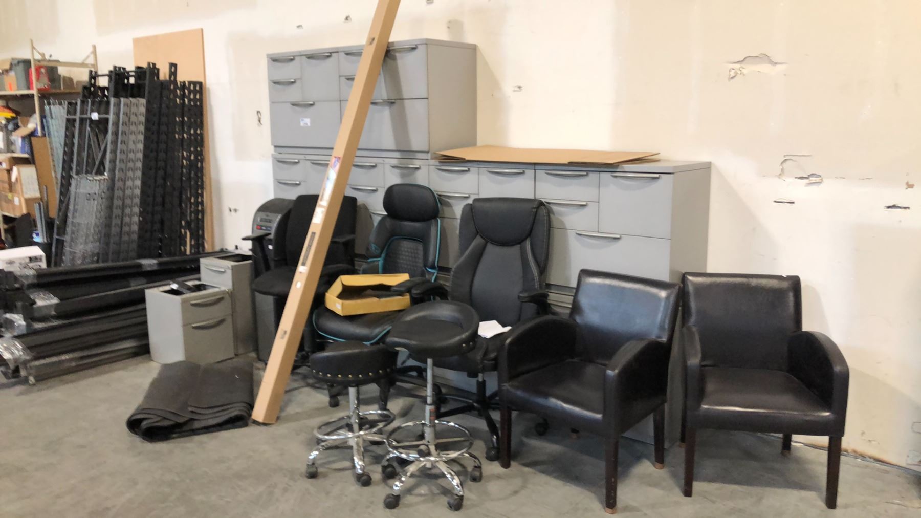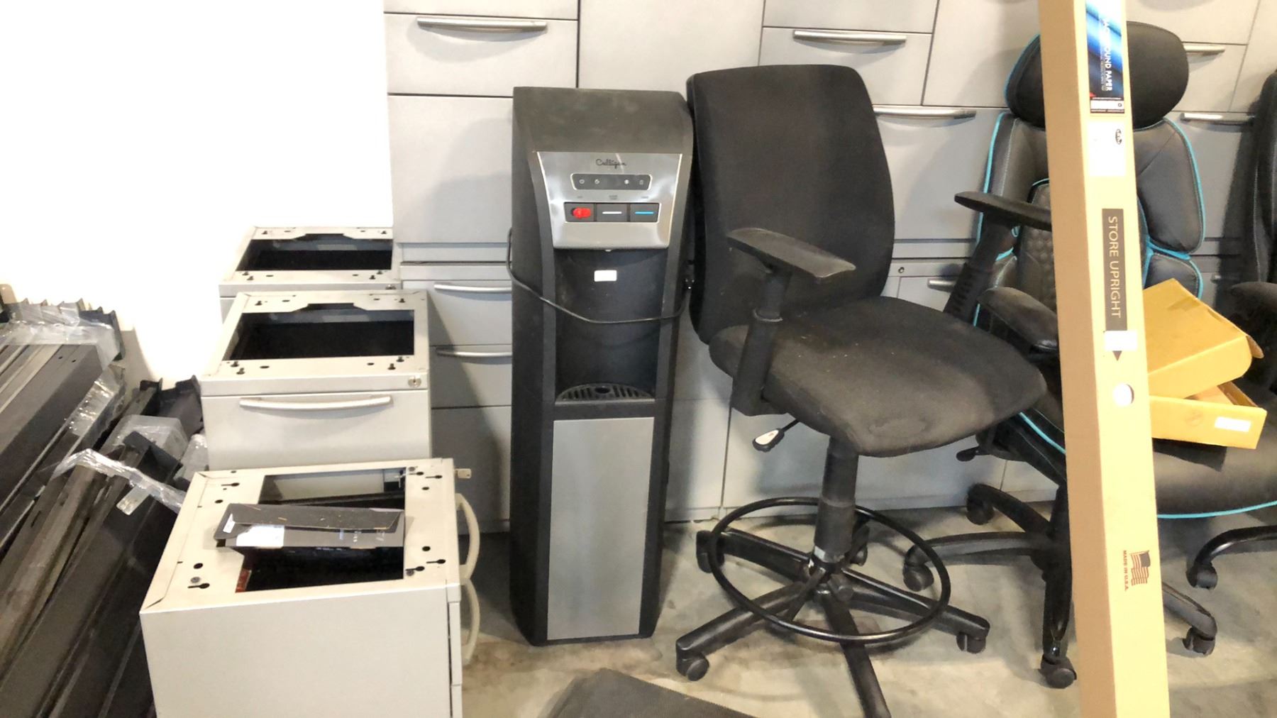 METAL OFFICE CABINETS W/ ASSORTED OFFICE CHAIRS, CULLIGAN WATER DISPENSER, RUBBER MATS AND SEAMLESS BACKGROUND PAPER - MUST TAKE ALL