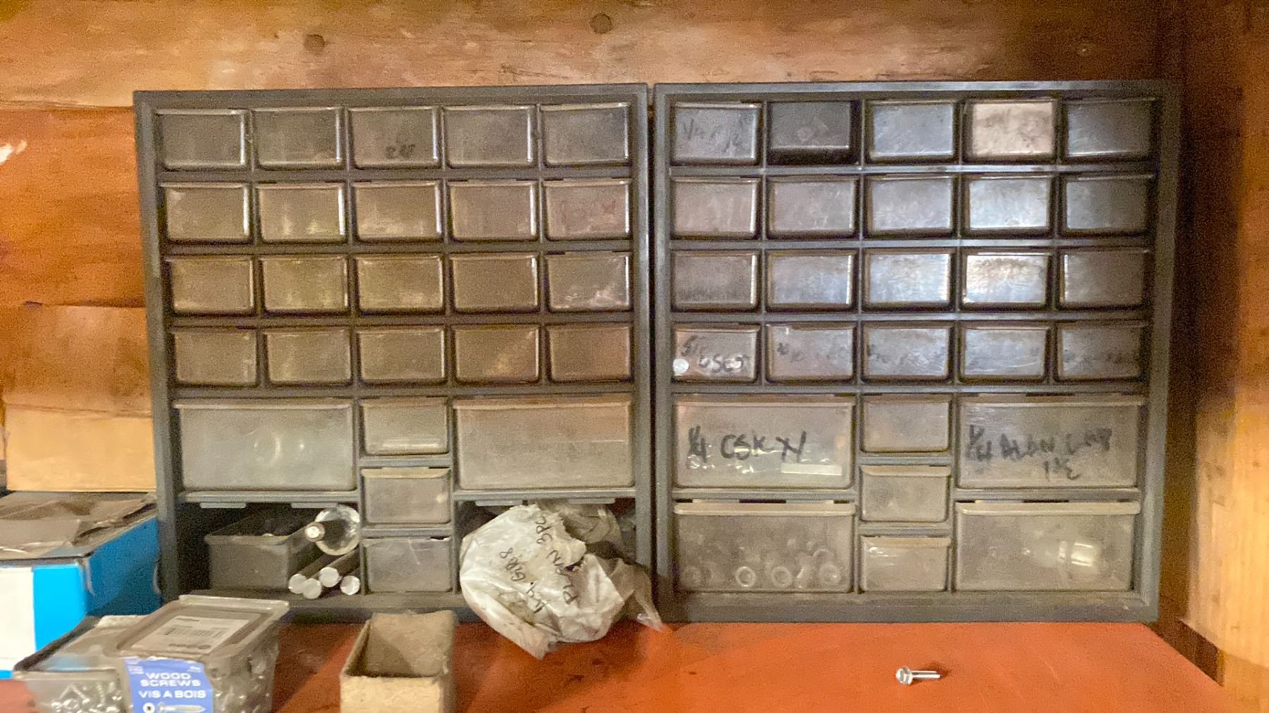 METAL PIGEON HOLE PARTS ORGANIZER & 2 SMALL PLASTIC PARTS ORGANIZERS WITH CONTENTS - NUTS, BOLTS & WASHERS