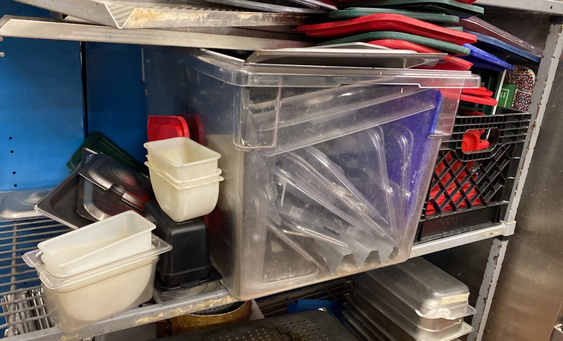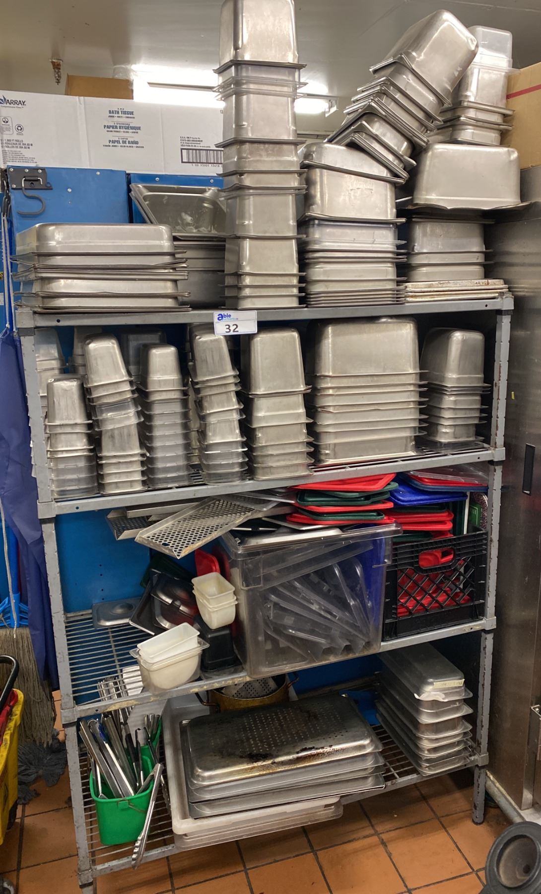 METAL RACK WITH CONTENTS. PROBABLY OVER 100 PANS OF ASST SIZES, LIDS, IMPLEMENTS ETC