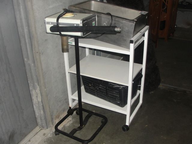 METAL ROLLING CART; SORISA BODY CHOCOLATE MELTING MACHINE, RESTUARANT STEAMER AND A BLACK PLASTIC LAUNDRY BIN OF ACCESSORIES