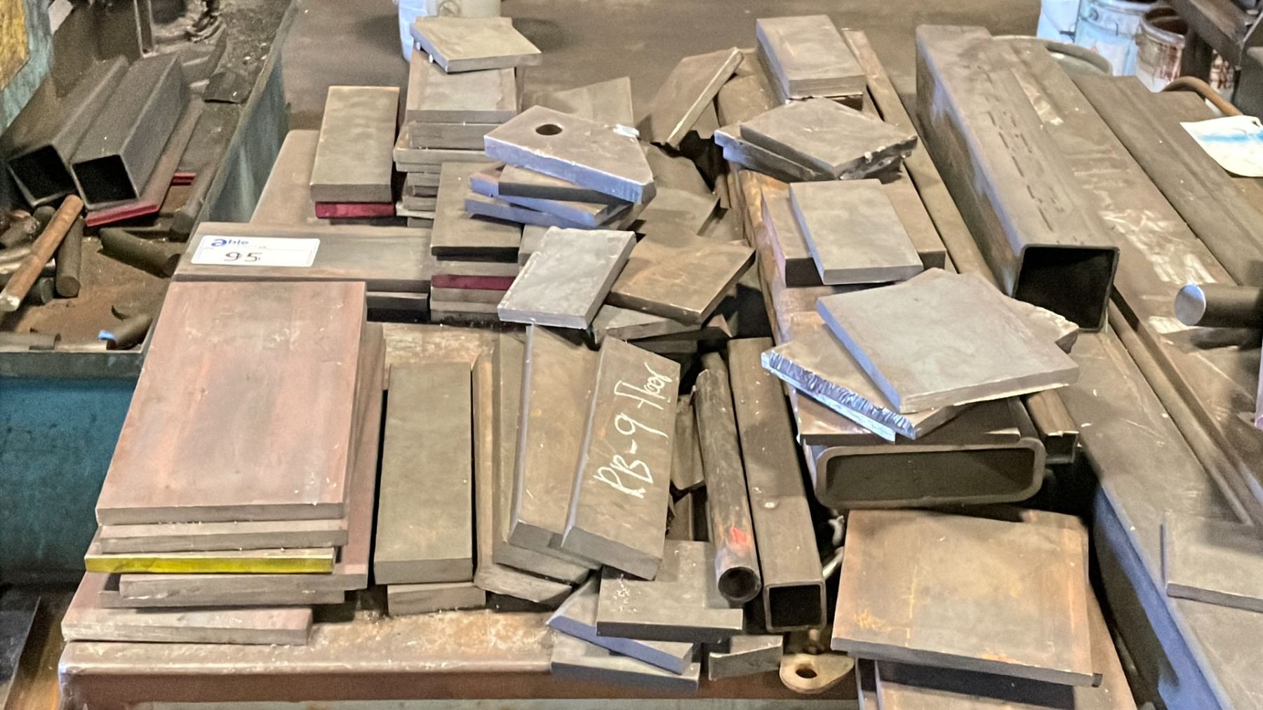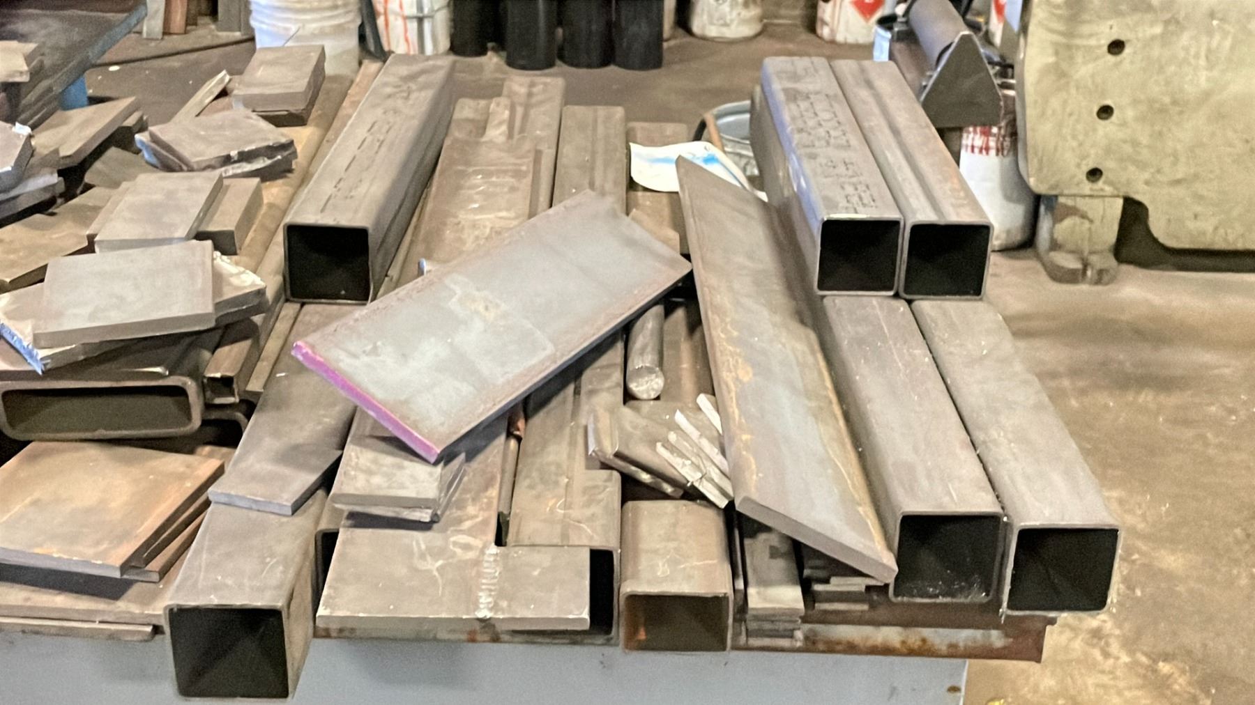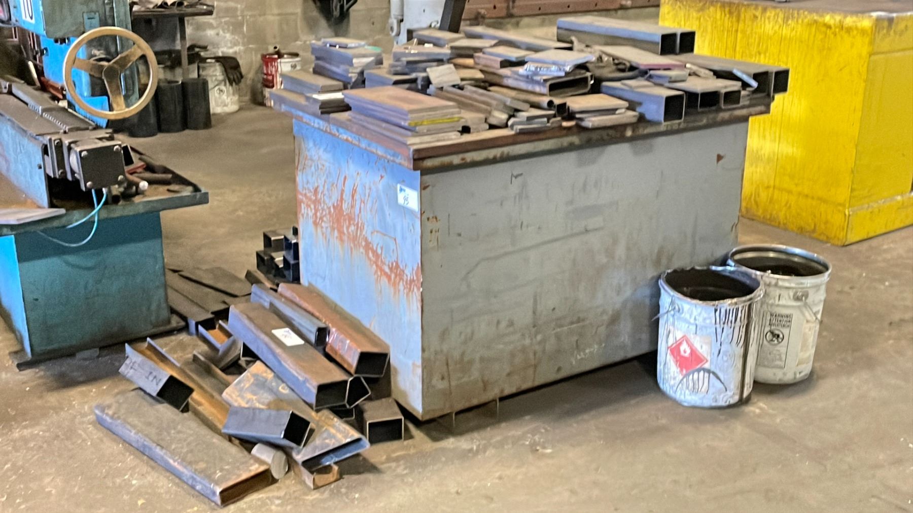 METAL SCRAP BIN W/FORKLIFT SLOTS AND ASSORTED STEEL SCRAP MATERIAL