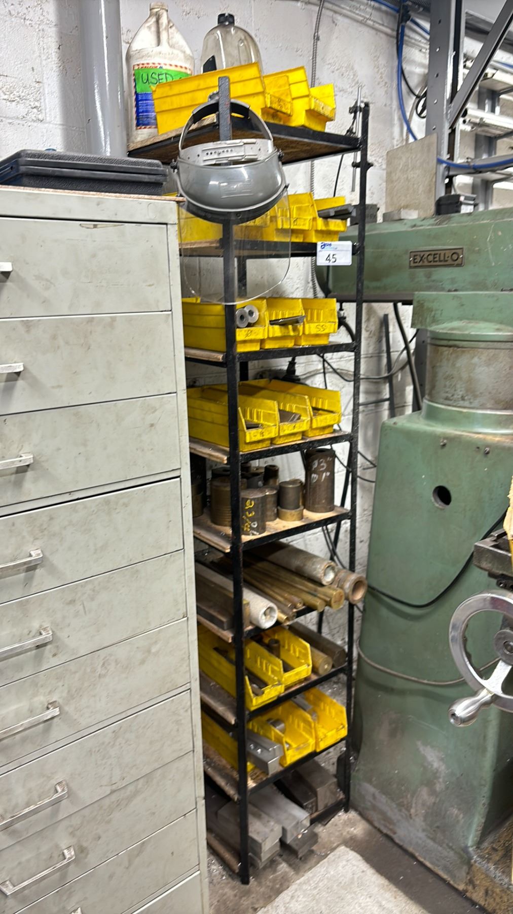 METAL SHELF UNIT FILLED WITH ASSORTED MOSTLY BRASS & ALUMINUM METAL HARDWARE - ROUND STOCK, FLAT BAR & BLOCKS