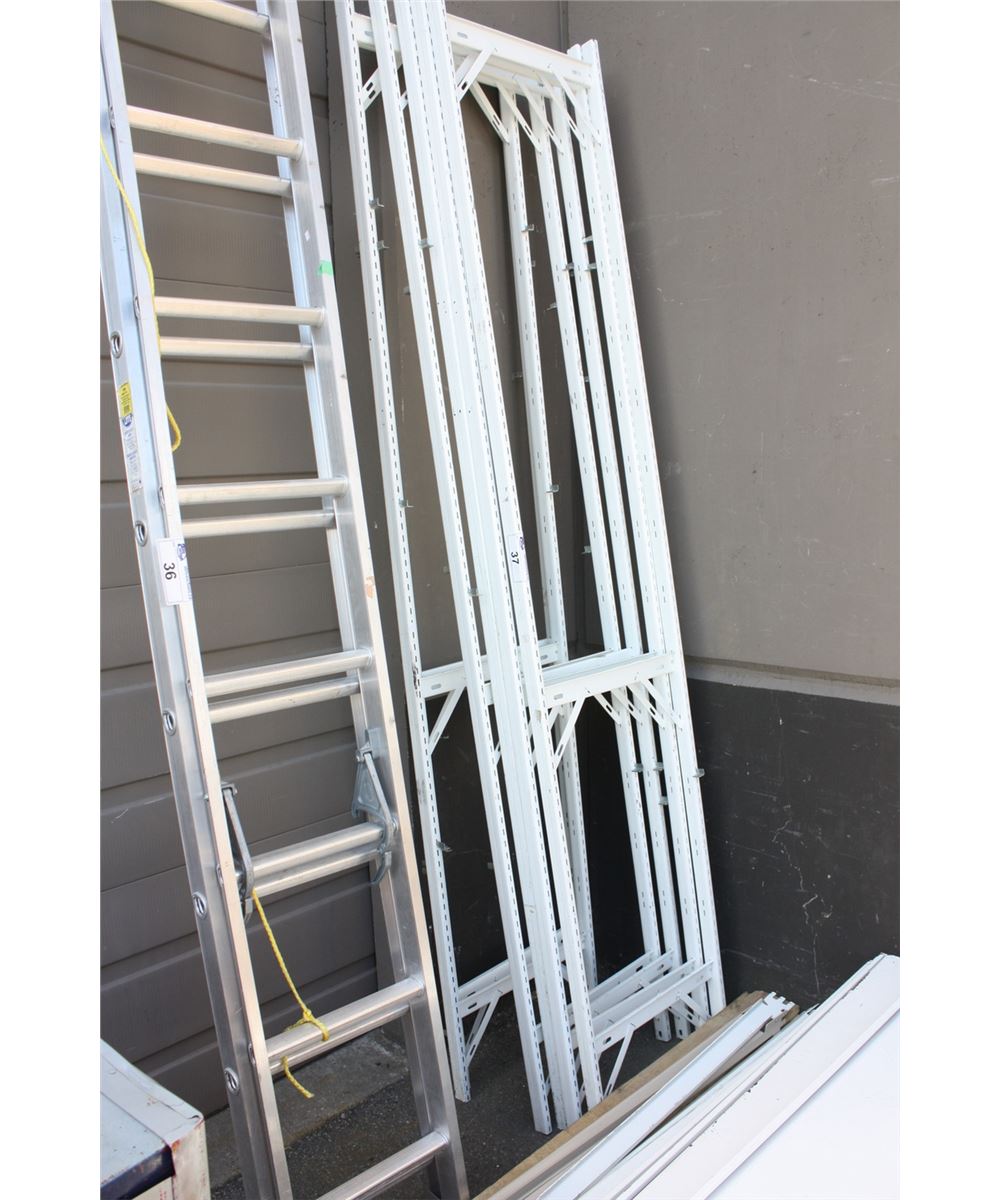 METAL SHELVING UNIT; 6 UPRIGHTS AND A PALLET OF SHELVES AND CROSS BARS